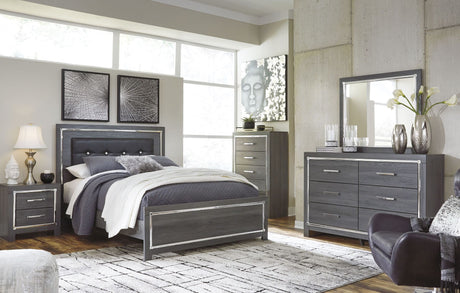 Lodenbay Antique Gray King Upholstered Panel Bed, Dresser, Mirror, And Nightstand