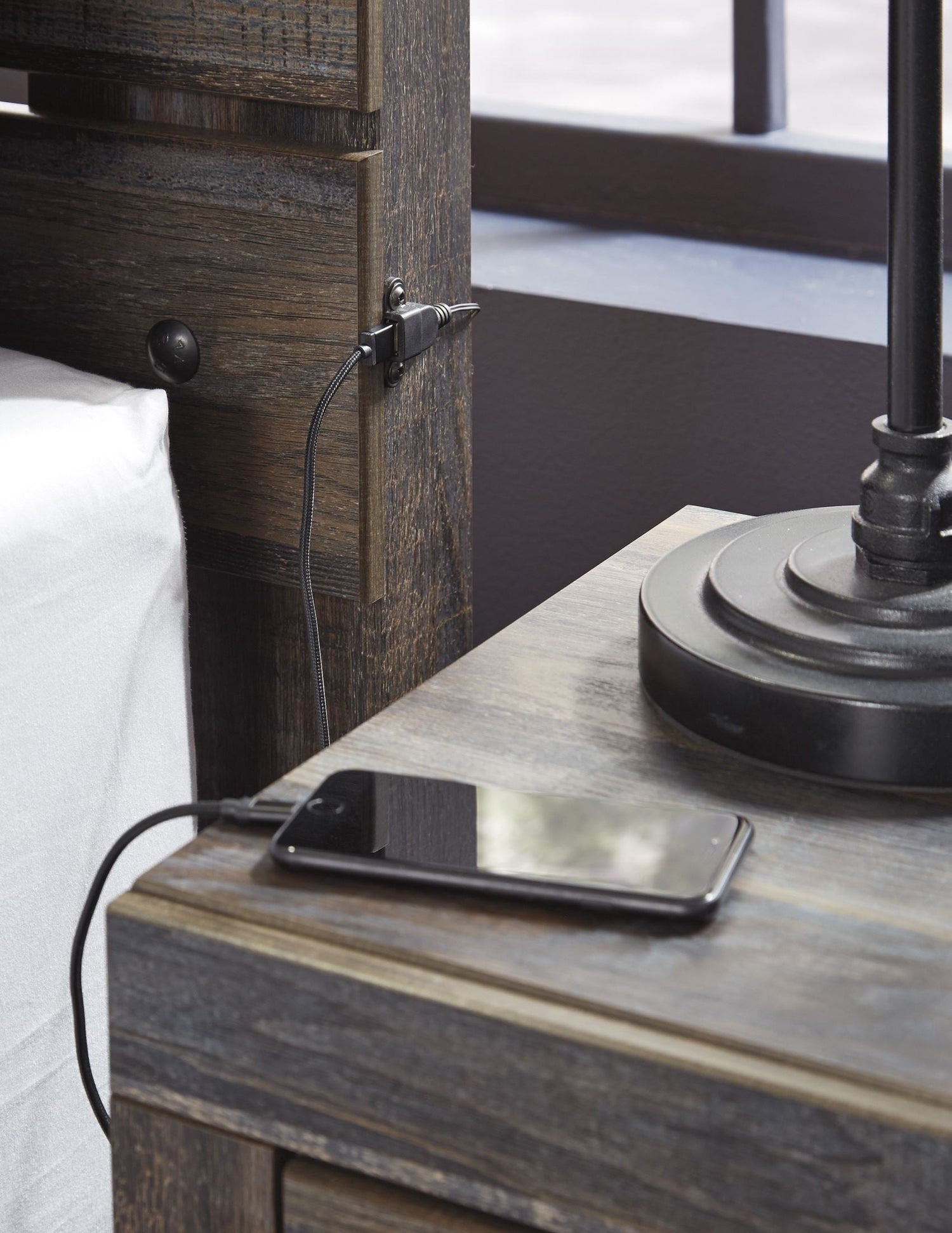 - Retro-chic light sconce and USB plug-ins on the headboard