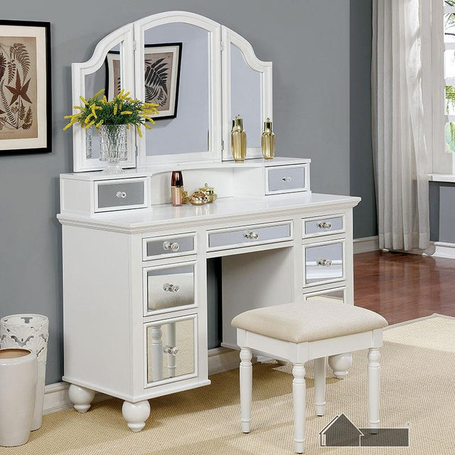 Shimmering mirror inserts and an extravagant tri-fold mirror create a dramatic statement that screams glam! The paired upholstered stool and many drawers of this contemporary style vanity set create a comfortably functional place to sit and prep for the day.