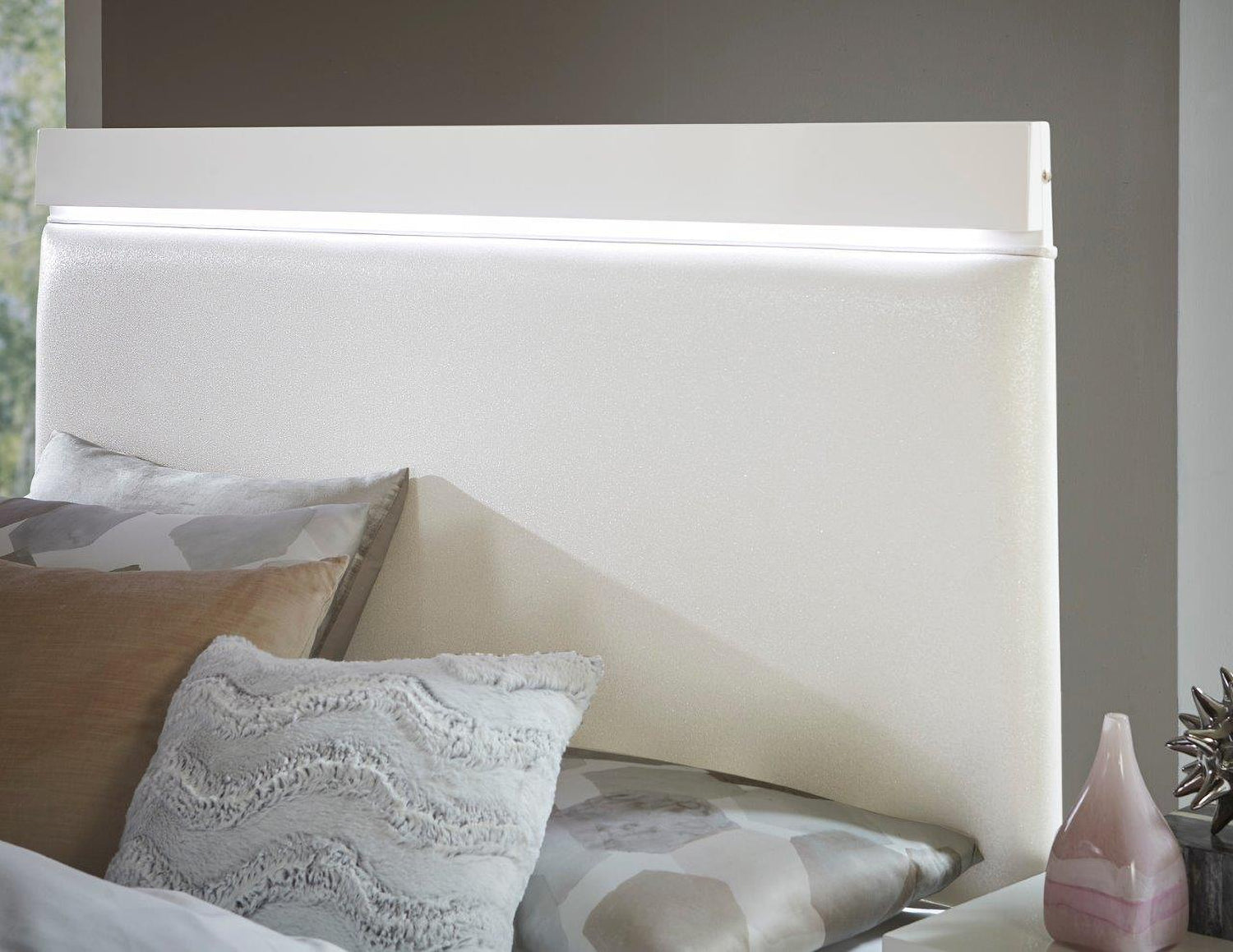 - White opalescent bi-cast vinyl headboard adds a shimmering effect
