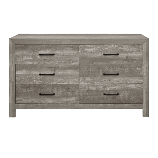 The style of the corbin collection is created by combining contemporary lines and rustic design in equal parts. the appearance of real wood is achieved by using a gray finish, which highlights the roughness of the 3d-printed paper veneer. the dresser's drawer fronts include black metal hardware, which provides a complimentary contrast to the rest of the piece. the profile of the dresser is defined by a subtle framing, which further contributes to the unrestricted design of the collection.