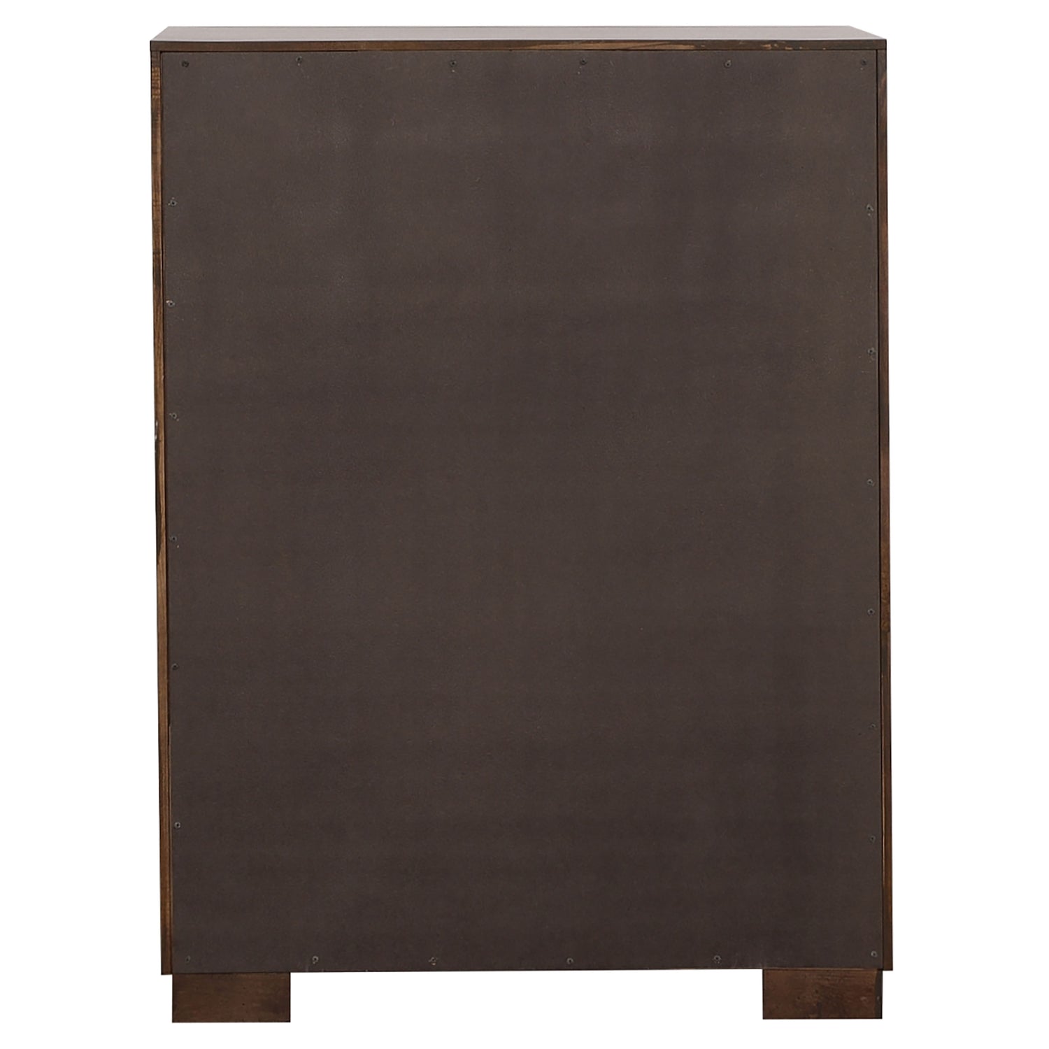 This stately 5-piece bedroom set is a showpiece set from the Jessica collection and includes a chest and dresser as well as nightstand that can be placed at arm's reach with the optional nightstand panel on the bed. The bed has smooth, clean lines and is crafted in a platform style for a modern touch. The nightstand and chest are fashioned with deep drawers highlighted by contrasting lustrous hardware for added style. The sturdy dresser features six drawers and a broad top perfect for the accompanying rectangular mirror. Each piece in the set is built from solid wood and ash veneers with a warm cappuccino finish that's also available in brilliant white.