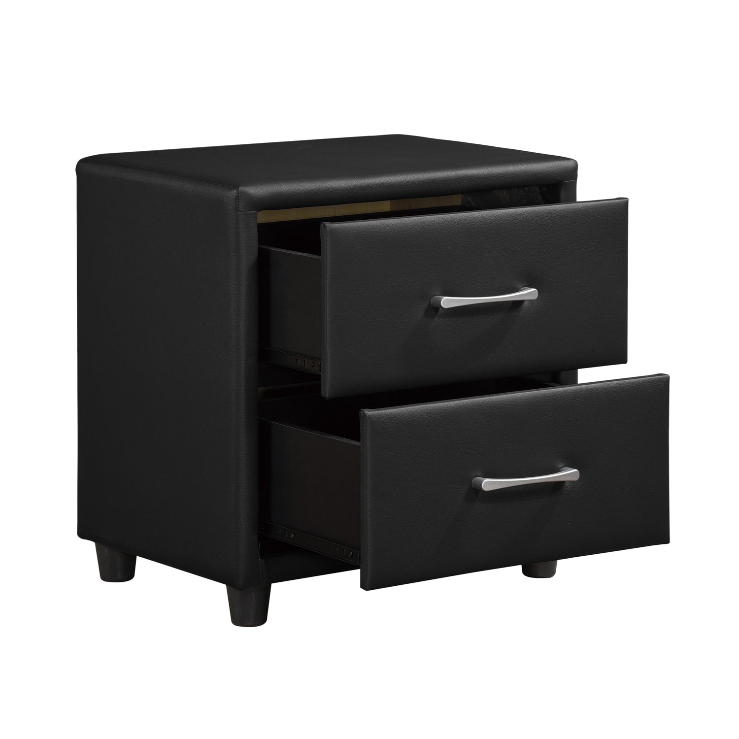 The nightstands in the lorenzi collection have a contemporary appearance that is accentuated by the addition of a long-lasting faux leather covering in black that is textured like leather. the nightstand's hardware, which is finished in a silver tone, creates a striking contrast with the surface's finish. this collection will make a one-of-a-kind and fashionable addition to your bedroom, as it is scaled to fit the needs of urban living.