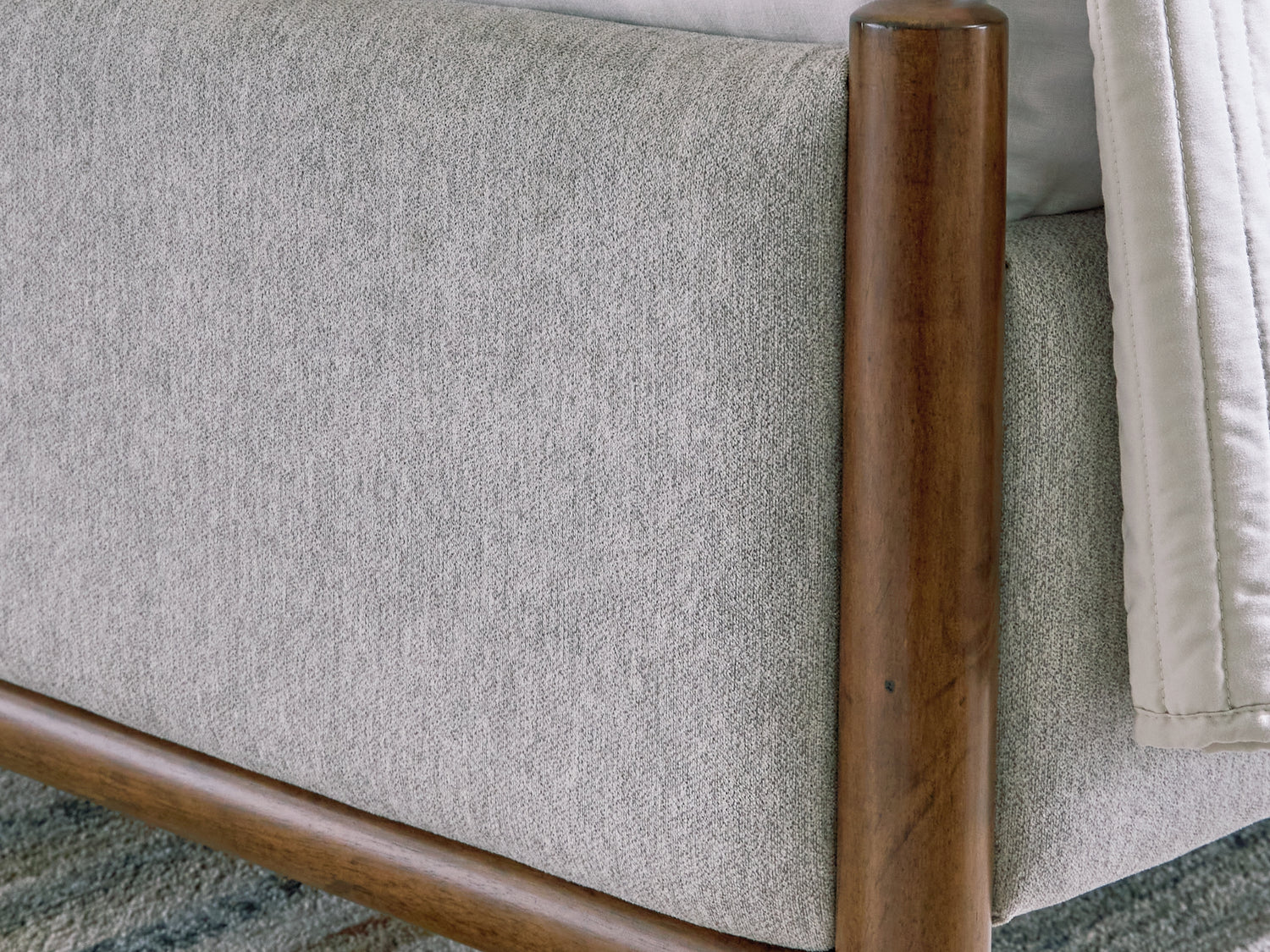 Series Features: Casual contemporary design. Made with hardwood solids, Mango wood veneer and MDF substrates. Finished in a medium brown natural wood tone. Clean case designs sit on round tapered legs with thick front frames and overlay drawer fronts for added dimension. Drawers feature French/English dovetail construction, fully finished interiors and heavy duty ball-bearing side glides for durability and smooth function. B615-81/-82 stylized poster bed with rounded solid wood frames and a sling style headboard cushion covered with a soft gray fabric. Two drawer nightstand includes a 110V power supply with USB-A and USB-C charging ports.