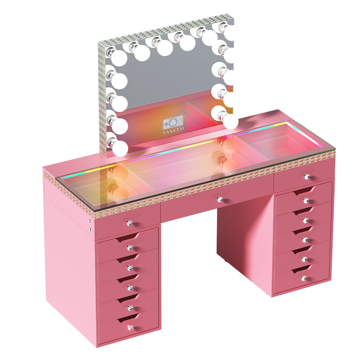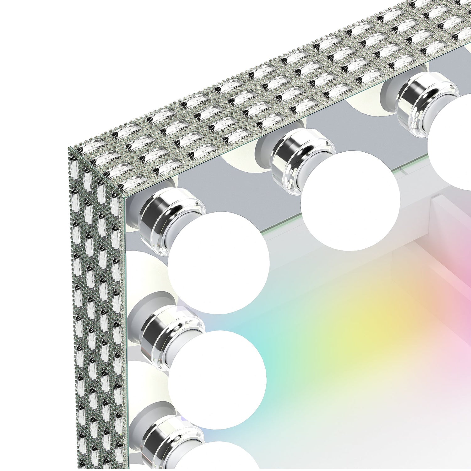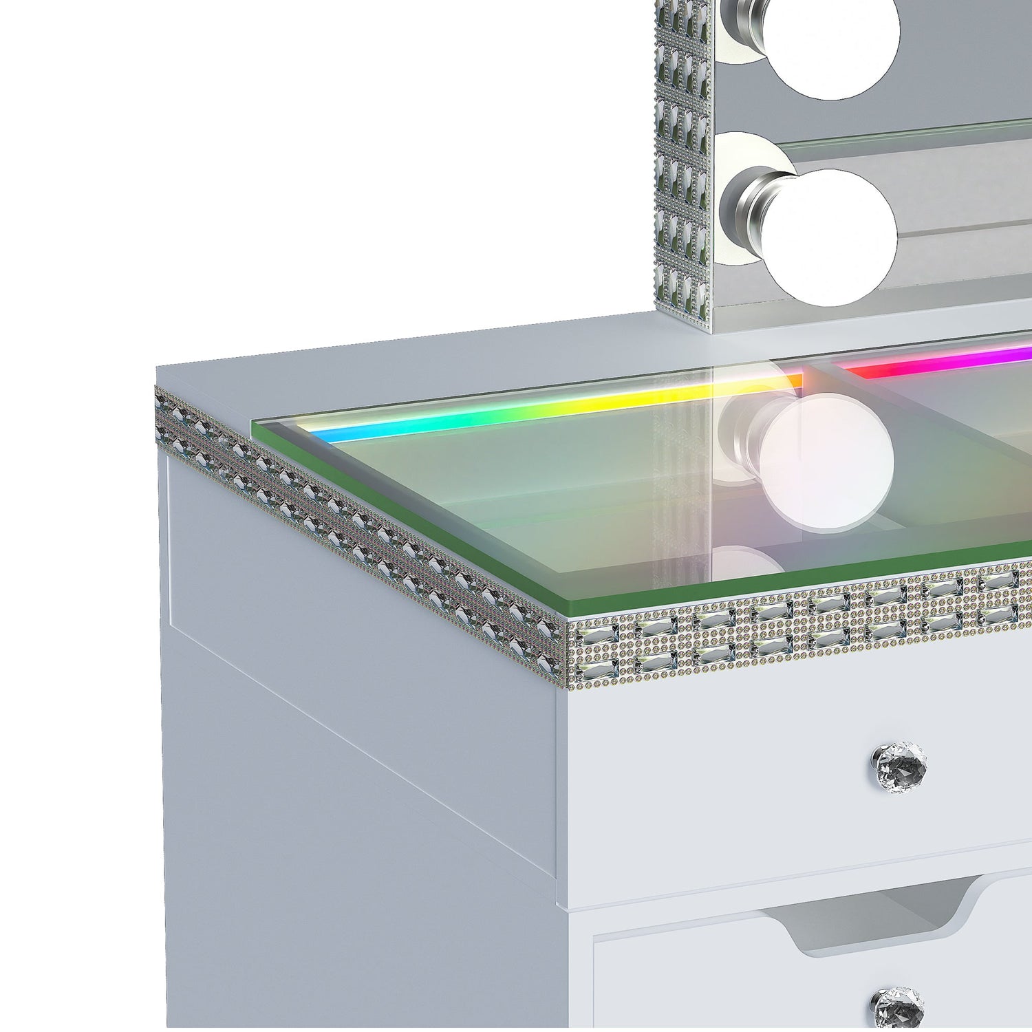 Elevate your beauty sanctuary with the VANITII Angel Vanity Set, a luxurious and tech-savvy dressing table designed for modern divas. This exquisite set features a 59" spacious tabletop, a grand 31.5" mirror with crystal diamond edges, and 13 elegant storage drawers with crystal handles. Enhanced with RGB mood lighting, Bluetooth speakers, and dual charging ports, this vanity merges Hollywood glamour with smart convenience—perfect for makeup artists, influencers, or anyone who loves a lavish beauty routine.