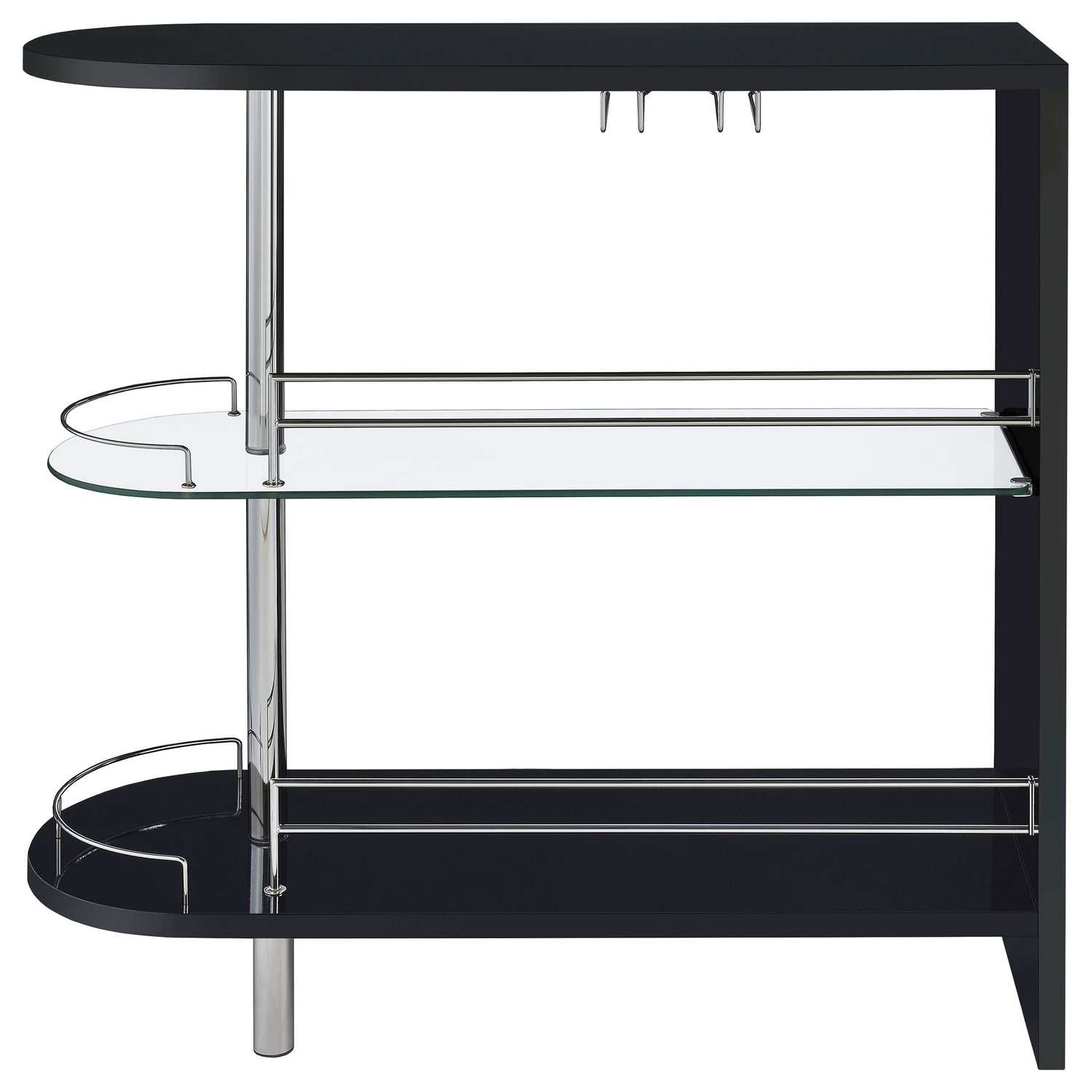 This stylish bar unit is a fabulous option for your entertaining needs. A sleek silhouette and glossy black finish give it a chic, modern appeal. Its tempered glass storage shelves offer a handy place to display a collection of fine wines and spirits. Protective guardrails help prevent accidental spills and keep bottles safe and secure. A handy stemware rack rounds out the versatile convenience of this contemporary bar unit.