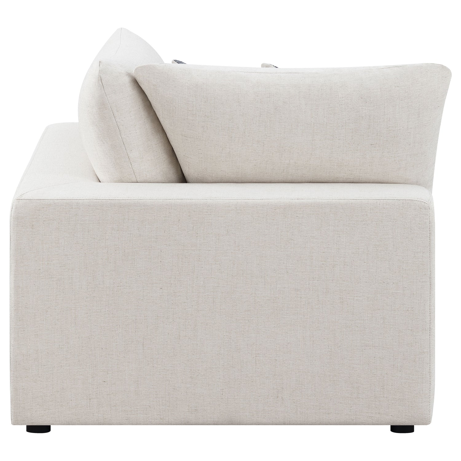 The roomy sectional corner creates comfortable backless seating. Or use it to rest your legs, or place items such as trays or magazines in easy reach. Linen provides beauty and textural interest. The natural color lends itself to any relaxed decor. It's a perfect end to a perfect sofa.