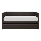 The adra collection offers a design that, when combined with clean contemporary lines and a dark brown faux leather covering, will complement the furnishings that you have in your home. the under-bed trundle may be pulled out to fulfill your additional sleeping space requirements, and the clean-lined design of the trundle makes it possible to position it in a variety of different room sizes and layouts, regardless of whether it is used for sleeping or lounging.