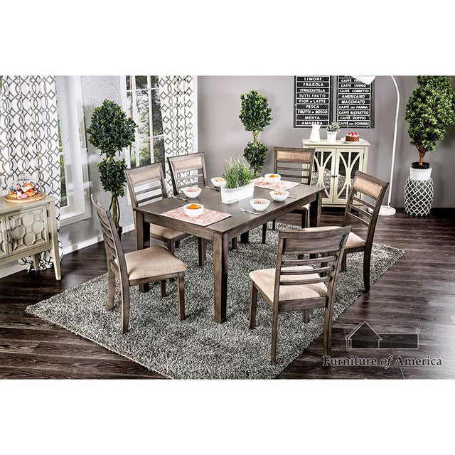 The weathered gray finish of this transitional style dining set gives a rustic vibe to a contemporary collection for a look with personality and more! The slat back chairs are upholstered in an off white fabric and filled with foam for a comfortable design the whole family will love .