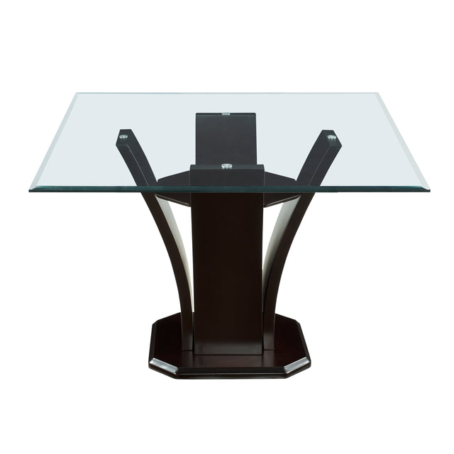 Daisy Collection combines superb visual appearance and fine quality that you need in your dining area. Three distinct elegant flared tulip bases support beveled glass tabletops on the square traditional dining height tables. The table is constructed of hardwood solids and veneers in a refreshing espresso finish.