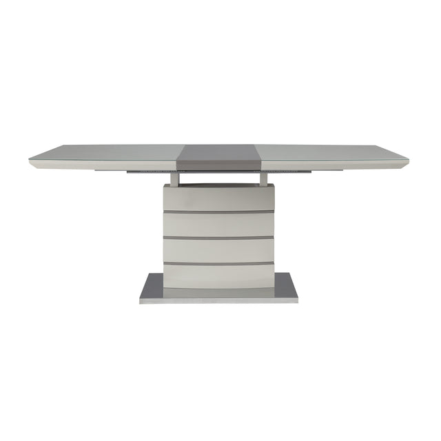 Sleek contemporary styling provides the platform which you will create your casual dining space in the Glissand Collection. Ultra-bright high gloss white and gray-taupe finish is paired on the tabletop and pedestal base, creating distinct contrast to the high polish chrome base plate. A smooth glide system opens with ease to reveal the self-storing butterfly leaf.