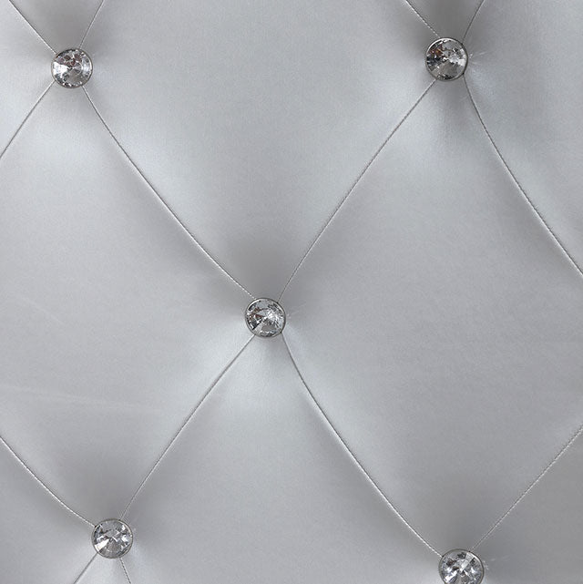 Shine and polish your dining room for pure glamour. Tempered glass and mirrored panels create a sophisticated elegance while the silver finish molds the details together for a luxurious dining set. Light up your prized collectibles in the glass-encased curio while the bar table provides a convenient space to concoct the perfect cocktail and store all your barware. Rest upon tufted leatherette chairs and sink into soothing comfort with its dense foam cushions. The expansive table completes the set, offering spacious room for six and carved tapered legs that steadily support the design.