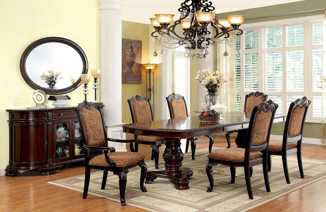 The centerpiece of this set is the beautiful pedestal table, which comes in two styles, adorned with intricate designs on the base and the apron. Three options for the side chairs are offered, as well as a matching mirror and server finished in brown cherry.