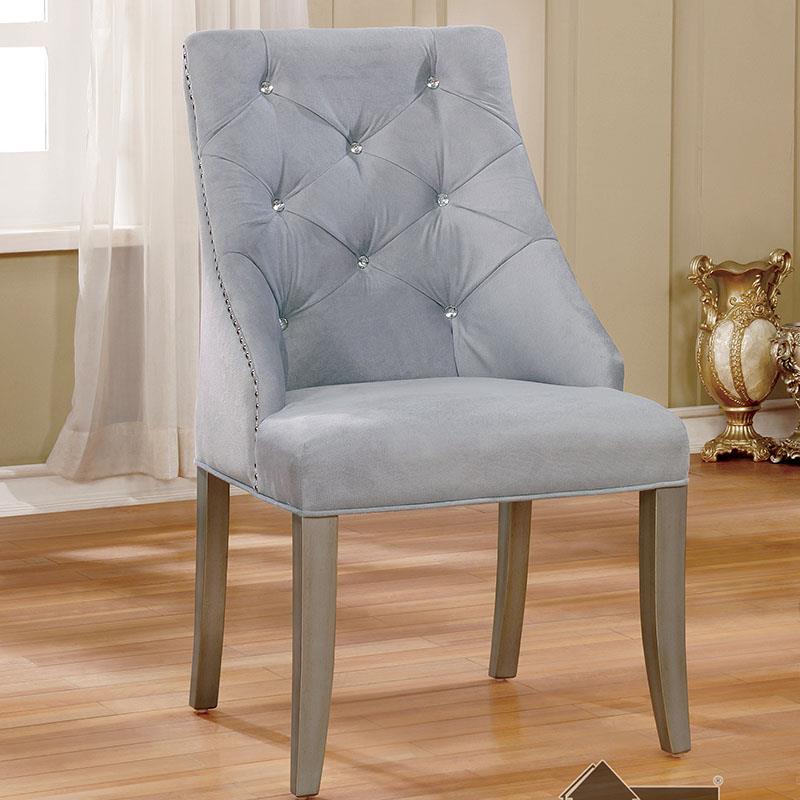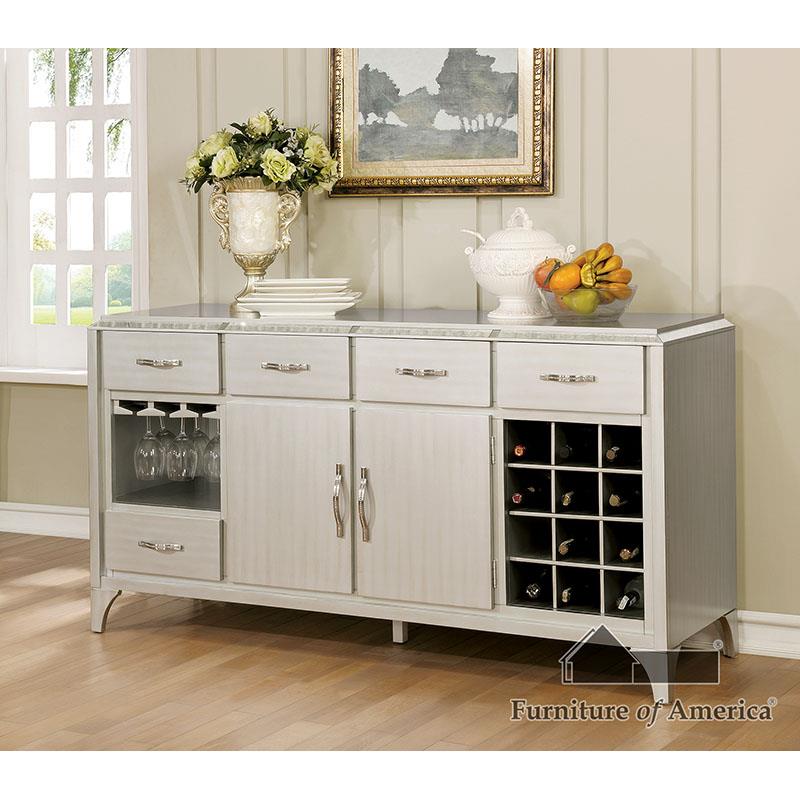 A glamorous design that will amaze guests of all ages, this dining collection is a superb addition to any formal dining room. The antique mirror inserts along the table top, lengthy bench and paired server adds a beautiful and elegant touch to the already charming silver finish. Padded flannelette chairs add comfort to the chic design with their tufted backs and soft coloring.