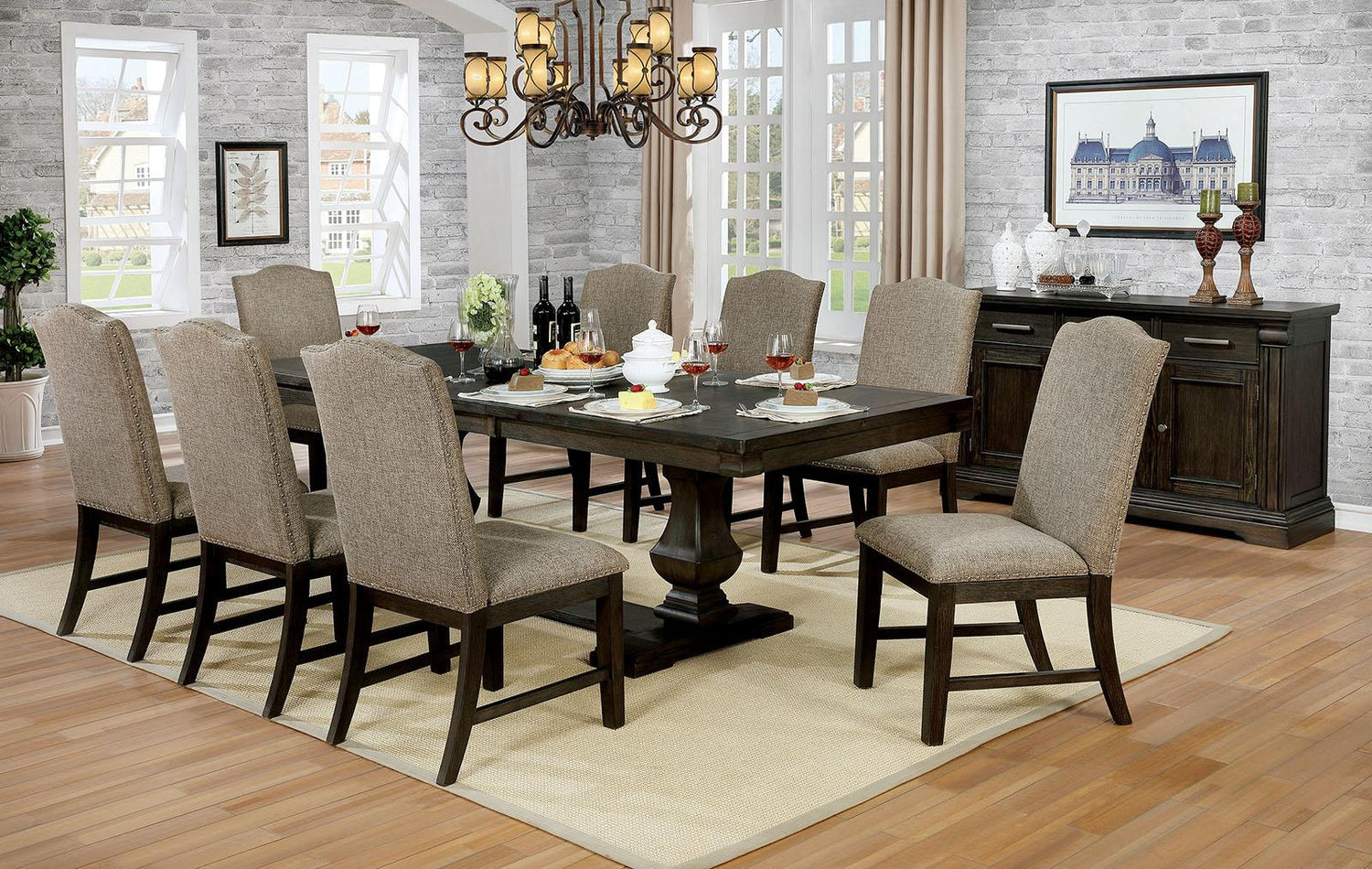 A strong table means a strong family. It becomes the heart of the home, where everyone sits down and enjoys each other's company. The pedestals and trestle make for a handsome silhouette. A matching bench provides seat variations that can be fun but also showcase the beauty of the set. The chairs are fabric upholstered with nailheads dotting the trim. Simple and rustic.