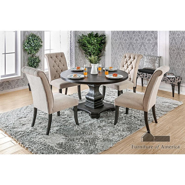 Enjoy breakfast, lunch and dinner in style. This round pedestal table comes paired with ivory linen dining chairs to create a luxurious atmosphere. Button tufting and a scrolled backrest emanate a regal and feminine style that pairs beautifully with the antique black finish.