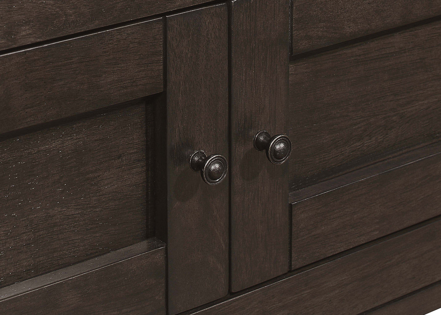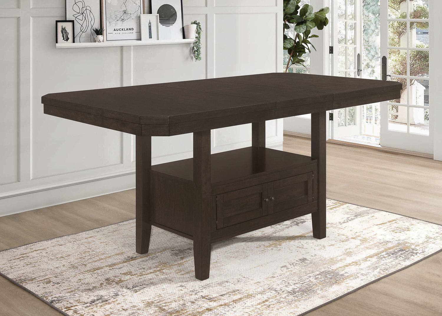 Create a more casual dining experience for family and guests with this elegant, rectangular counter height table. A rich, cappuccino finish brings a warm brown hue for a traditional touch. Designed with a large storage base, it also offers plenty of space below to keep your dining essentials. Four cabinet doors adorned with shiny metal knobs open to reveal a roomy interior, while an open bottom shelf presents a space to display cookbooks. Invite extra guests to dinner, extending the butterfly leaf.