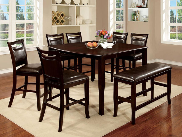 This complete dining set features a bold table with simple angles, padded leatherette chairs and a matching bench perfect for entertaining guests and family.