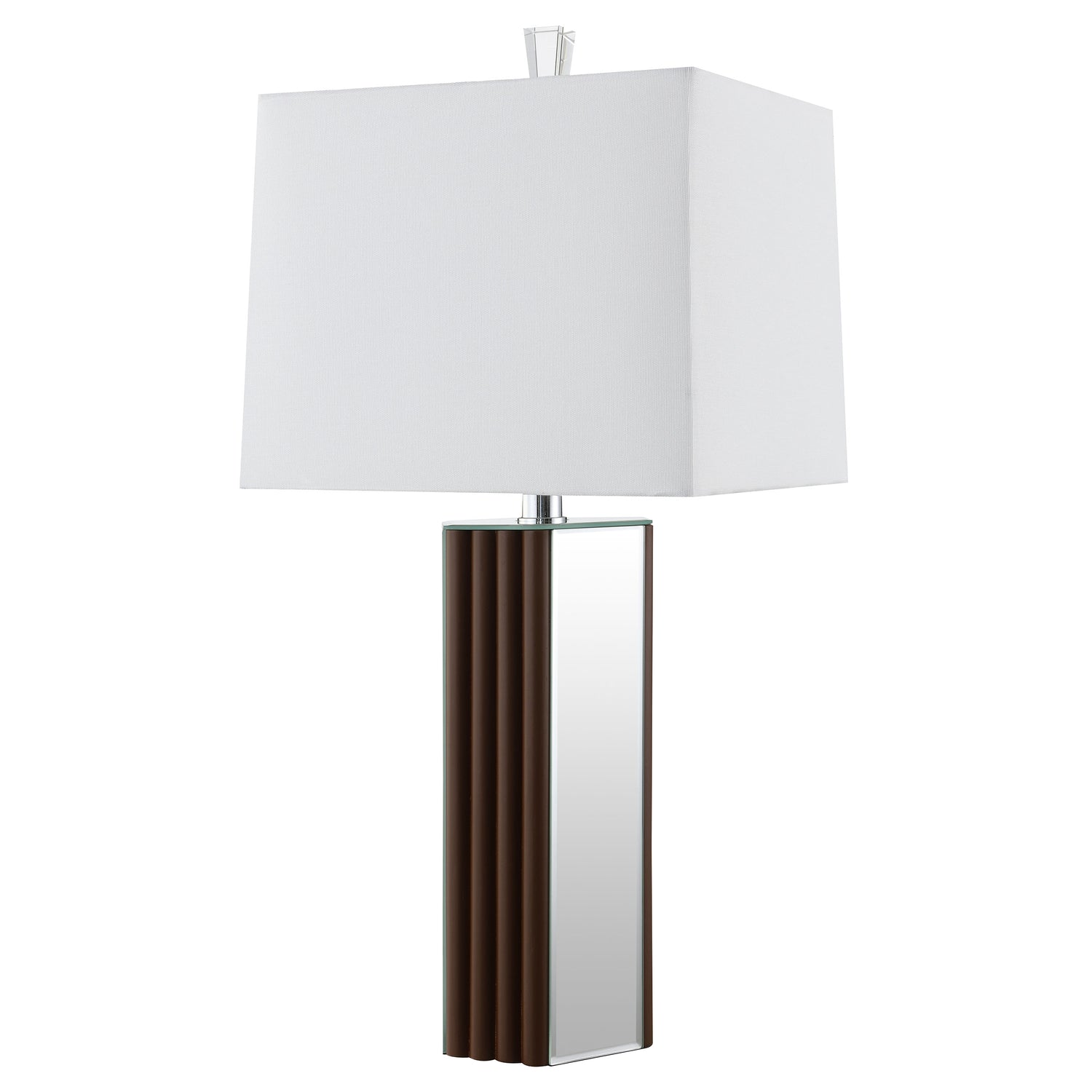 Establish a chic look and feel in your living room with a modern table lamp design. It's a rich, warm choice, featuring a deep brown finish and scallop details that create a sense of texture and artisan character. Mirror panels add brightness and reflectivity, offering contrast without sacrificing cohesive appeal. On top, a flared rectangular shade is covered in white fabric for soft, diffused illumination. A 9-watt LED light bulb offers bright, energy efficient illumination, perfect for tasks and ambiance in a living room, den or bedroom.