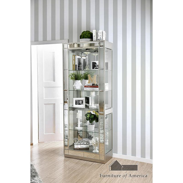Let this chic curio cabinet make a dramatic statement in your contemporary home with its brilliant silver finish! The mirrored accents decorating the frame cast a reflection on your decorating taste while also accenting any decorations on display atop the tempered glass shelves. The glamorous frame will add extra class to your d