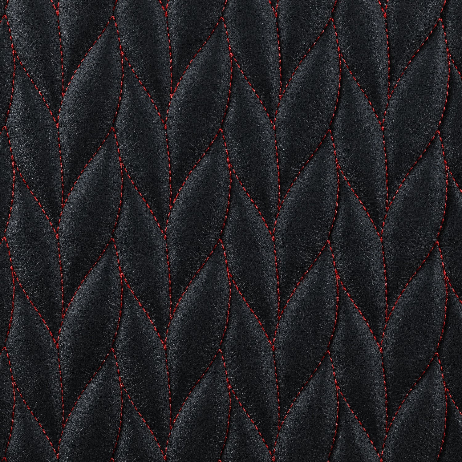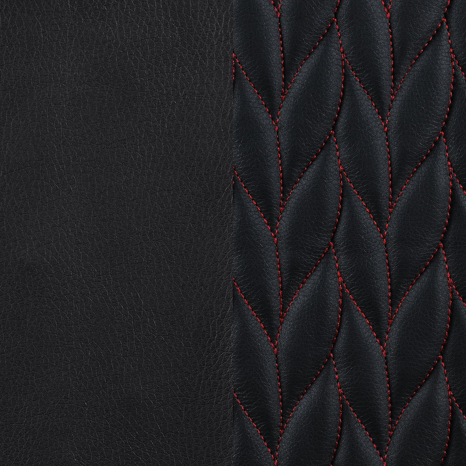 Perfect for a modern home office, this contemporary office chair is wrapped in a black leatherette that offers a bold statement piece. Accenting the black leatherette is a botanical-inspired herringbone pattern with a red stitching details, giving a subtle pop of color. Rounded padded arms provide a place to rest your elbows, while a padded headrest and seat offer long-lasting all-day support. Mounted to a rolling base with five wheels, this mobile office chair easily glides throughout the office space to retrieve items and more. In addition, this office chair can be adjusted, lifted to fit your preferable desk height.