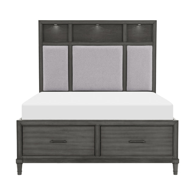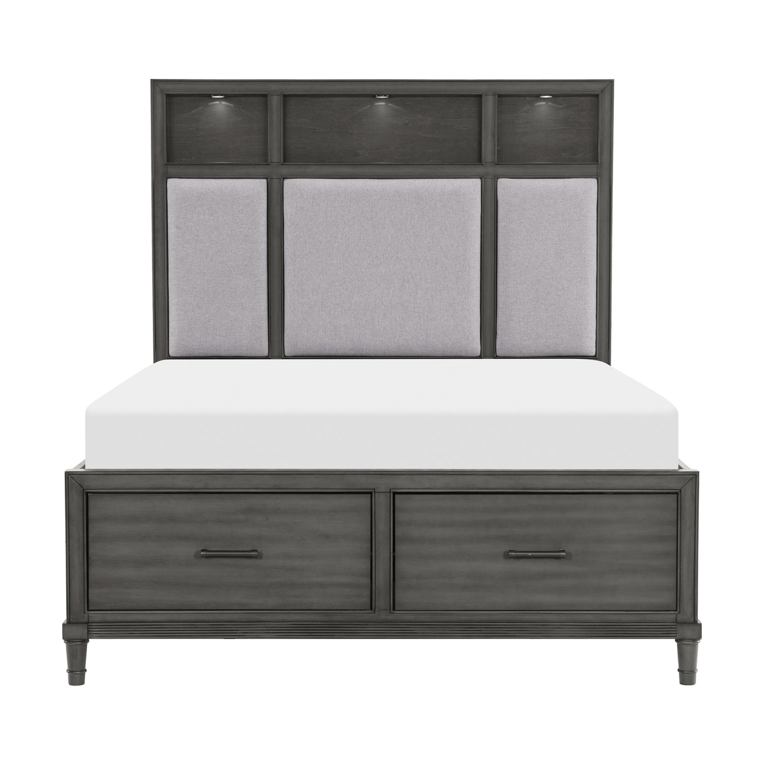 Modern convenience is paired with transitional style to create the versatile look of the Wittenberry Collection. The multi-functional design of the queen bed allows for convenient storage within the footboard drawers, charging capability by way of the mounted USB ports, as well as display and illumination within the touch-engaged LED-lit open fronted bookshelves of the headboard. The bed’s headboard also features pebble gray hued fabric inserts creating complementing contrast to the collections gray finish over okume veneer. Dark bronze finished knob and bar hardware front the drawers of the footboard.