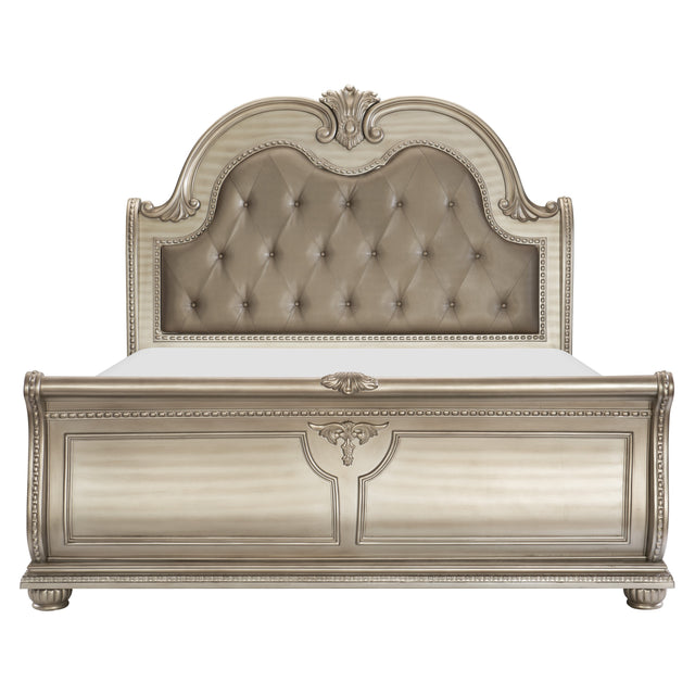 The Cavalier Collection exemplifies the finest in Old World European design inspiration. Egg and dart base moldings, bead molding and acanthus leaf carvings all blend to achieve an elegant addition for your traditional bedroom. The grand Queen sleigh bed features a faux leather, button-tufted headboard insert. The bed’s beautiful details are accented by the silver finish on birch veneer.