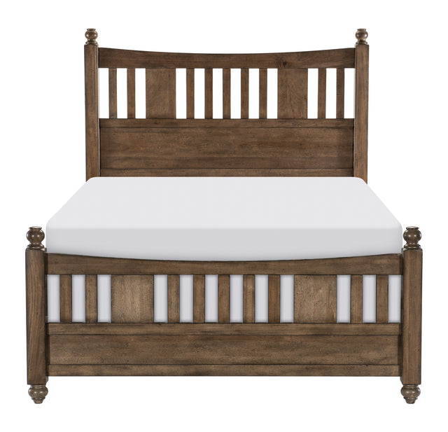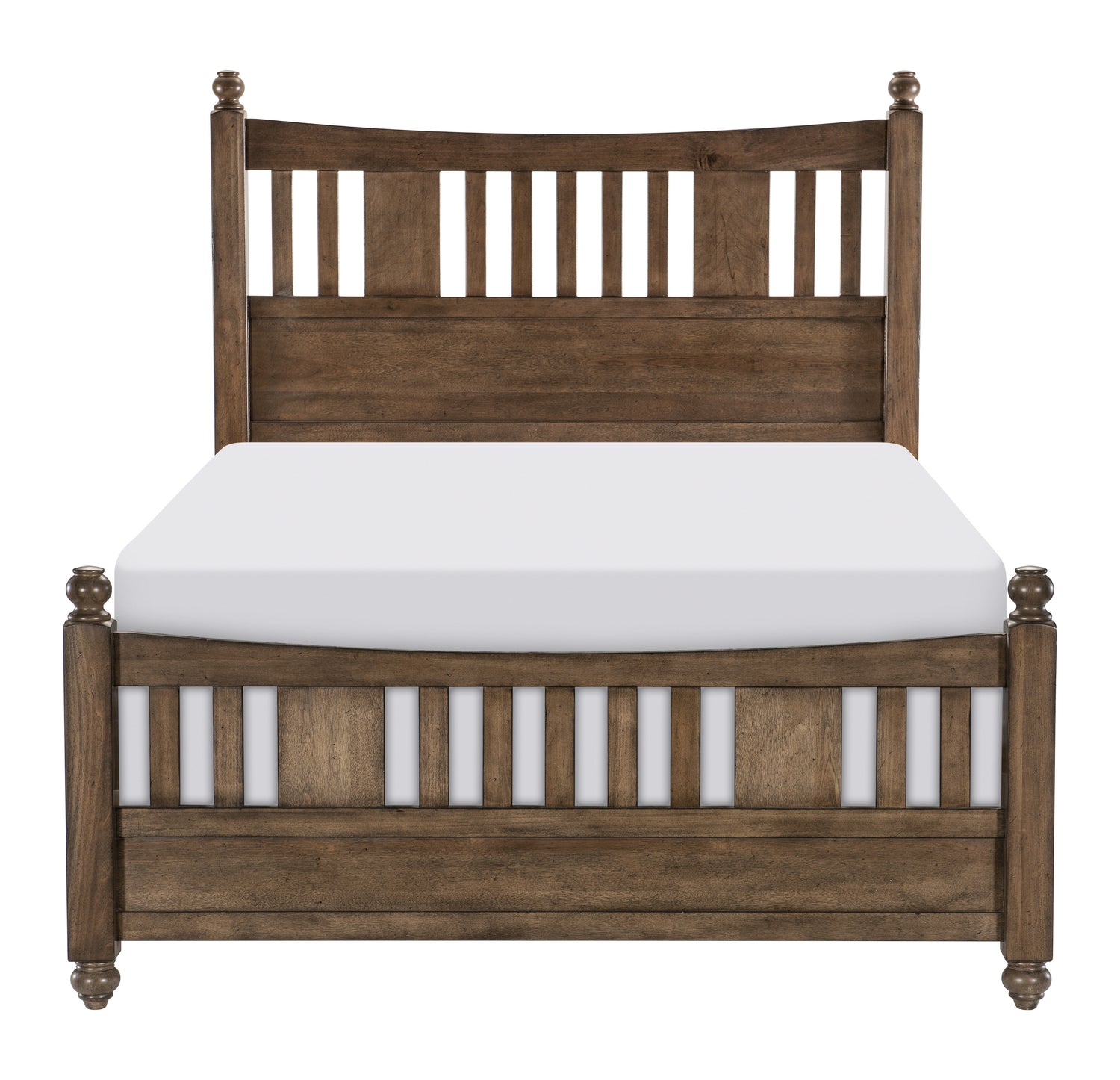 The brevard collection is a wonderful confluence of rustic and transitional aesthetics, and its versatile design enables it to be placed in a variety of different bedroom settings. the birch veneer has a light brown finish, which gives a neutral background for your creative decorating ideas to shine against. the style of the california king bed features vertical slats that are framed by posts that are crowned with finials.