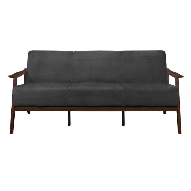 The profile of the carlson collection's frame harkens back to an era when understated elegance reigned supreme in terms of fashion. the covering on the sofa is made of dark gray velvet, which is highlighted by the streamlined design of the sofa's subtly sloped wood arms and legs, which are finished in a dark walnut.