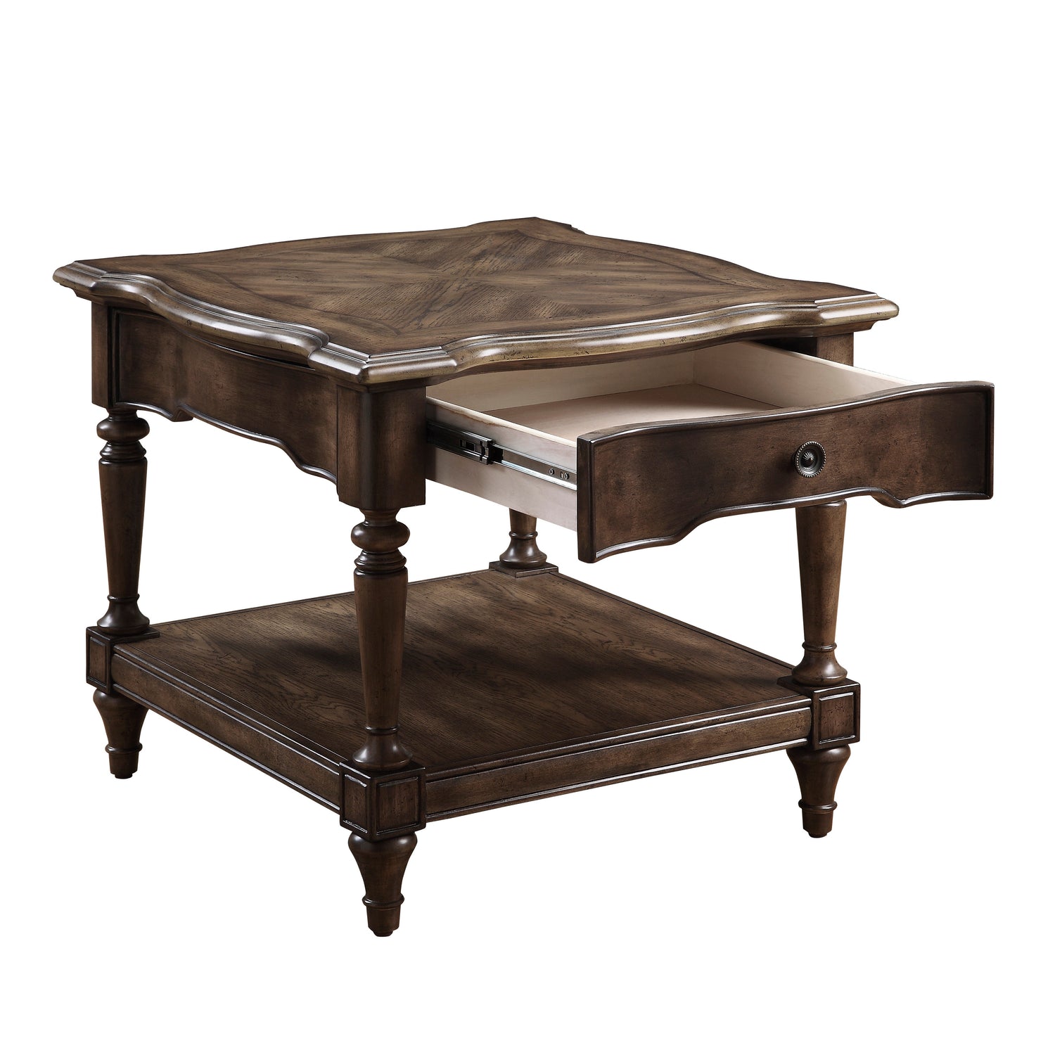 The heath court collection features an exquisite profile that is made up of timeless components that have been skillfully integrated to produce the ideal complement to the traditional decoration of your house. the distinctive wood grain is brought out by the brown finish that is applied to the top of the end table, which is made of white oak veneer arranged in a sunburst pattern. the metal knob hardware that fronts the working drawers of the table has an antiqued brown finish that looks rather nice. the set has a traditional look thanks to the twisted legs that support the open display shelf and the ornate corners that are incorporated into the table's shape.