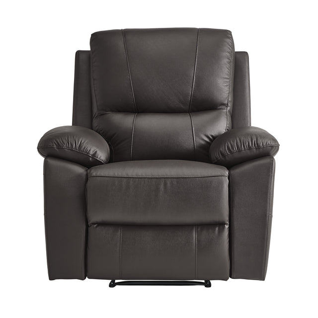 The velvety seating, pillow-top arms, and adaptable appearance of the dawson collection make it the ideal piece to incorporate into the casual living space of your house. the chair has a covering of brown imitation leather on the upholstery. when activated, the manual motion mechanism of the dawson collection allows you to go from a seated to a reclined position in a smooth motion. this mechanism is activated by pulling a tab that is positioned on the side of the chair.