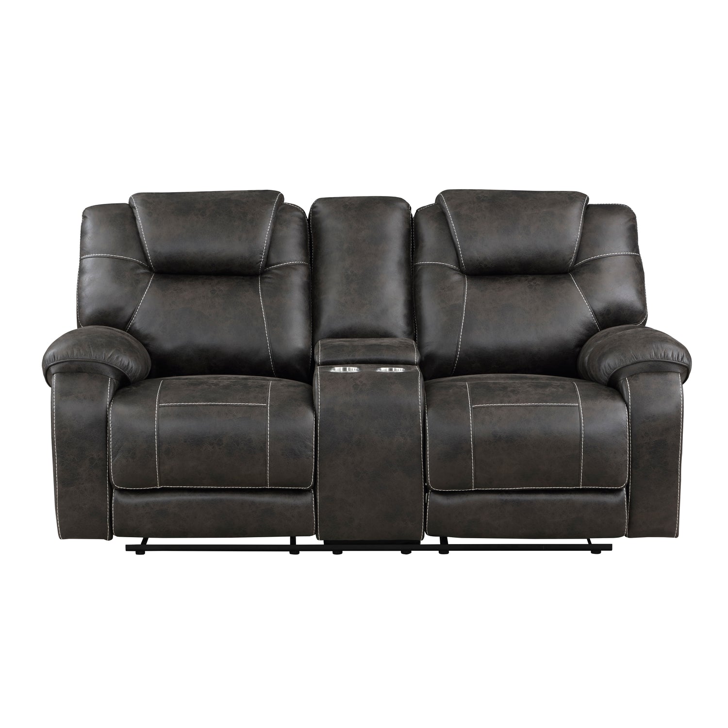 Creating a space that welcomes your friends and family to have a seat and settle in comes in the form of the Gainesville Collection. The love seat is offered in chocolate-hued polished microfiber, with contrast stitching, making this piece a versatile transitional style option for your living room. Manual motion mechanisms operate with the pull of a side-mounted tab, that once engaged, takes you from seated to reclined in an easy motion. The love seat’s center console features ample beverage containment with cupholders, as well as featuring a hidden storage compartment, and is flanked by its dual reclining seats.
