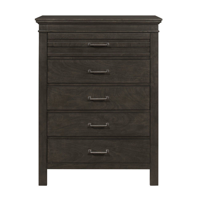 The blaire farm collection's transitional styling is the ideal compliment to the rustic vibe that served as the design's source of inspiration. the chest is covered in a charcoal gray finish, which brings out the natural beauty of the okume veneer. the fronts of the drawers are adorned with fixed handle pull hardware, and the top drawer features a horizontal accent for visual contrast.