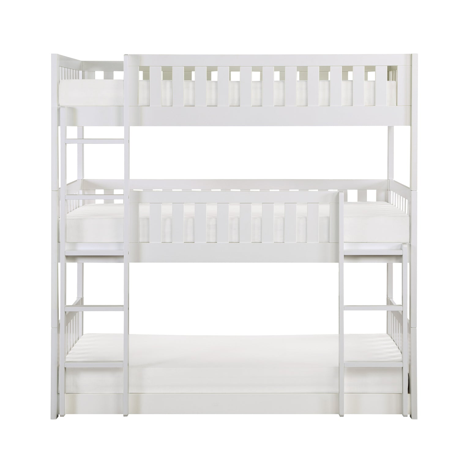The chic galen collection will help you make the most of the space you have for sleeping. the fact that this triple twin bunkbed in a transitional style comes in a white finish makes it a good option for use in a variety of different types of settings for kids bedrooms. the floor serves as the foundation for all three of the sleeping platforms, which are connected by a ladder at various levels.