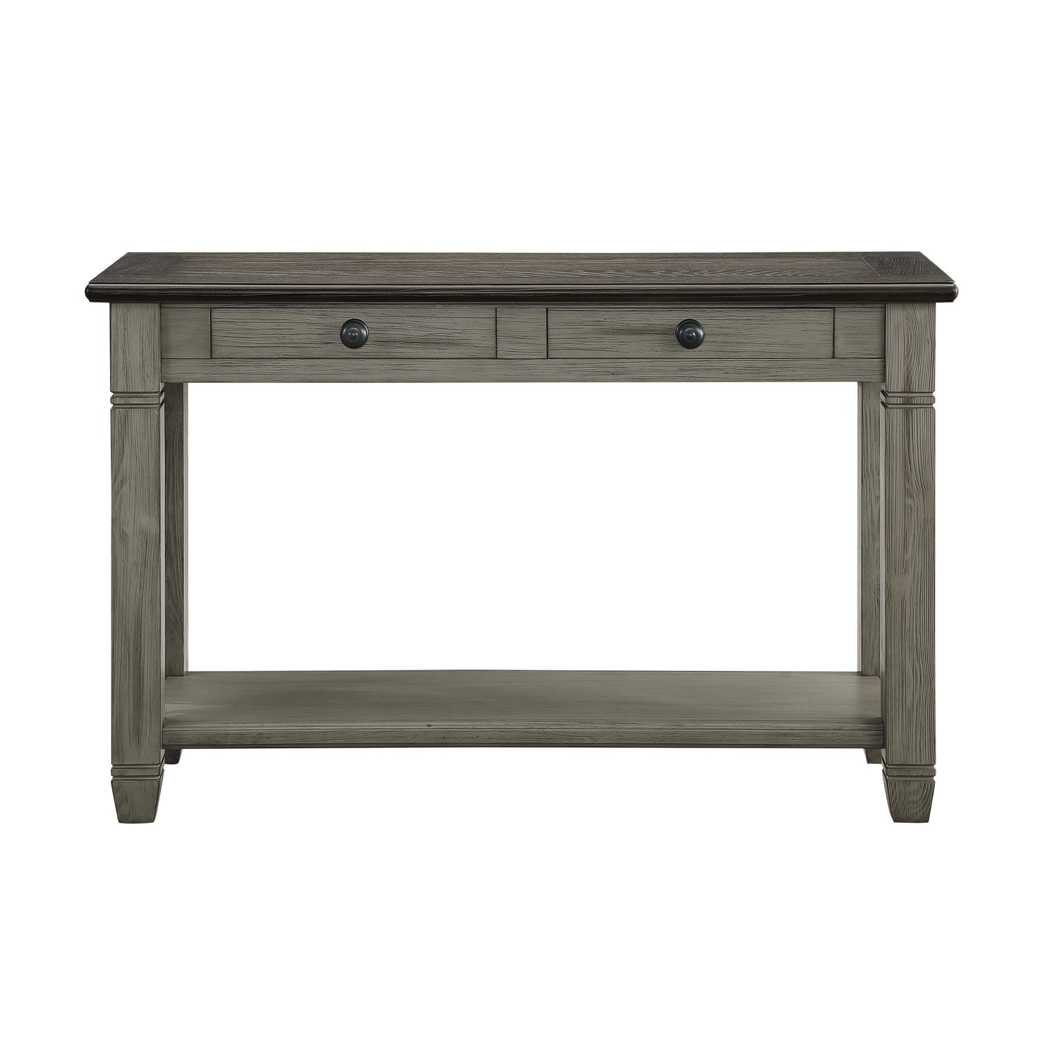 The granby collection has an occasional table set that is both aesthetically influenced by the style of a casual country home and functionally designed to provide a decorative accent for your living space. the two-tone appearance of the acacia and pine solids foundation, which has been painted in antique gray, and the oak veneer on the tops of the sofa table, which has been finished in coffee, present a color combination that is harmonic and ideal for your house. the knob hardware on the functioning drawers is made of metal and has a dark finish. this creates a subtle contrast with the overall finish of the collection. your decorative accessories can be put on full show using an open display shelf, which is the ideal location for doing so.