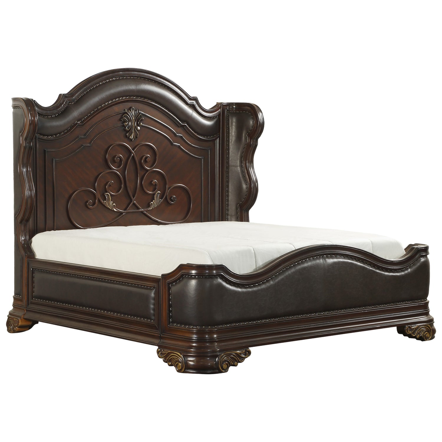 The royal highlands collection features stately designs that are well suited for the more conventional home. each piece in the series features ornate scrolling, with lighter, more delicate scrolling accenting the pilasters and foot of each piece, while heavier, carved scrolling graces the headboard. the distinctive serpentine form of the bed is carried over into the design of the case components thanks to the strong wood framing that surrounds the bed. the dark cherry finish is set off well by the contrast provided by the brown imitation leather. the royal highlands collection features traditional cherry and birch veneer accenting, which contributes to the collection's already beautiful appeal.