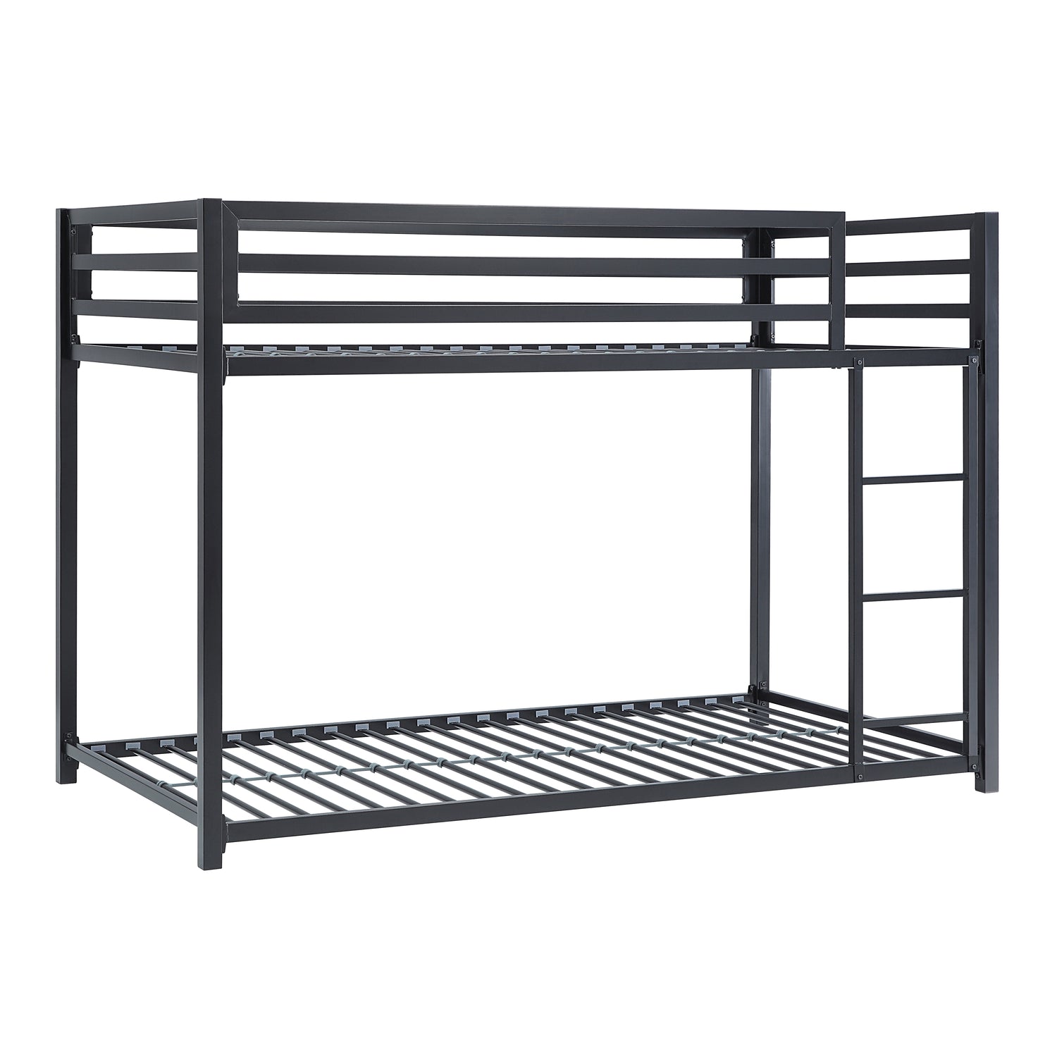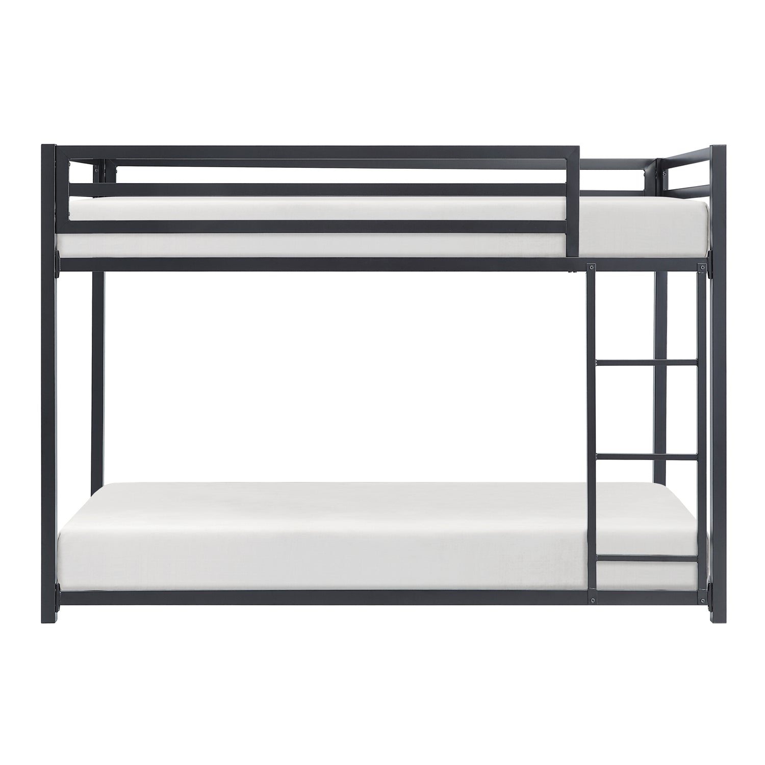 Your children's bedroom can benefit from an imaginative sleeping area solution provided by the jovie collection. the ground-level platform of the twin-over-twin bunkbed is a novel take on the traditional design of the stacked bedroom classic, which makes getting ready for bed a breeze. additionally, the attached ladder makes it simple to stake a claim on the top twin bunk. the bunkbed, which is made of metal framing and has a black finish, functions as a neutral canvas over which your children's imaginative and imaginative stylings can be superimposed.