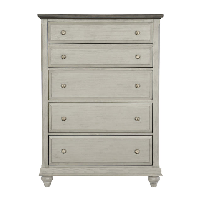 The mossbrook collection gives an homage to modern farmhouse design by featuring a profile that is timeless and will make an excellent complement to the décor of your home. a finish in a light gray that delicately brings out the grain of the wood is applied to the pine solids and oak veneer that are included in this collection. the knobs in an antique pewter tone that are placed on the front of the drawers give contrast, as does the dark brown top of the chest.