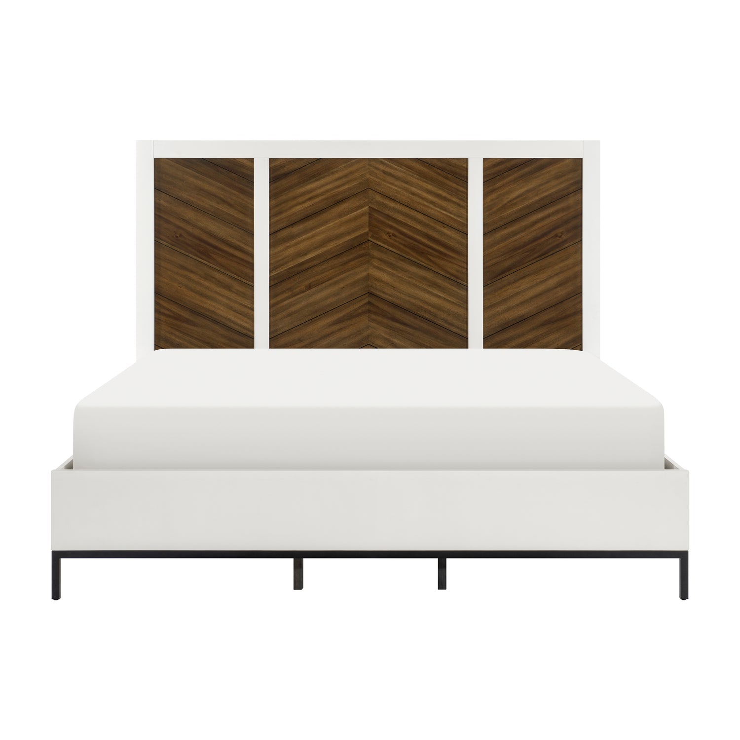 The oslo collection, which perfectly reflects your desire for inspired design thanks to its clean lines and dramatic accents, is thoroughly contemporary while also giving an homage to the mid-century design aesthetic. acacia veneer cut in a v-match pattern covers the front of the eastern king headboard. the walnut finish, which highlights the headboard's distinctive grain, offers a contrast to the dazzling white finish of the bed's framing. the bed is supported by metal legs that have been finished in black.