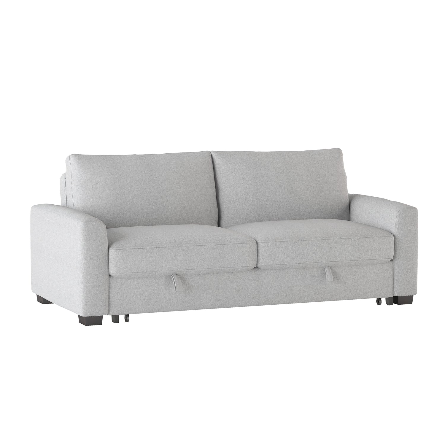 The price collection offers a one-of-a-kind seating solution for your home since it goes above and beyond the call of duty in terms of its utility. this sofa's seat back has a mechanism that allows it to click into place, transforming it into a pull-out bed that may be used for sleeping or lounging. the traditional design, which is rendered in a gray fabric cover for the sake of decorative neutrality, further enhances the placement potential within a variety of household contexts.