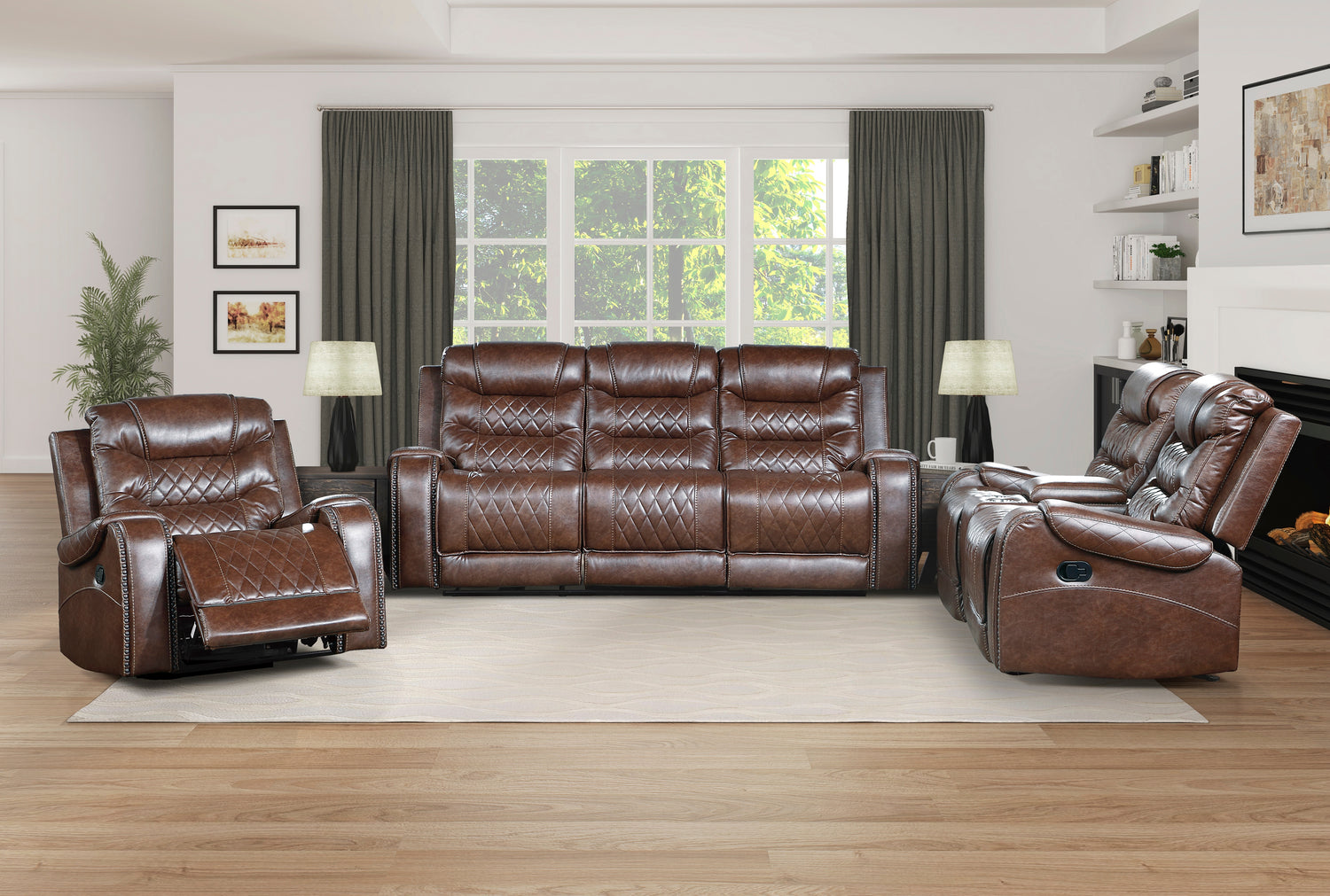 The putnam collection will provide you with a seating group that is not only elegant but also functional and comfy for your living area. the chair has a power reclining mechanism as well as a usb connector, which enables you to position it and use it in the most optimal way possible within the area you have. the putnam collection is presented in a brown polished microfiber fabric with diamond pattern stitching and nailhead-adorned arms for a traditional appearance of ornamental elegance.