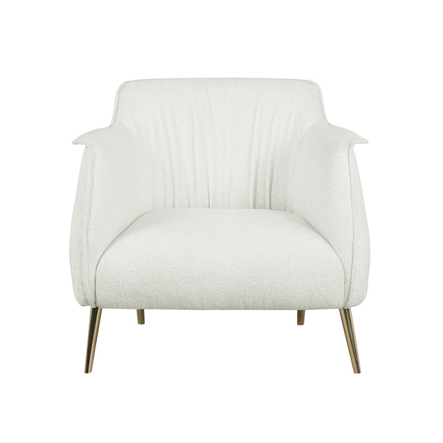 The rachael collection is a magnificent pairing of lines, texture, and color that shines like a hollywood star. it is the perfect combination to represent the contemporary design of your house because of the way the three elements come together. this sophisticated accent chair has knife-edge designs that are covered in white boucle fabric upholstery. gold-finished stiletto legs offer stability for the chair. the enveloping seatback conforms to the shape of the seat's contour and rises to meet the softly flared profile of the arm.