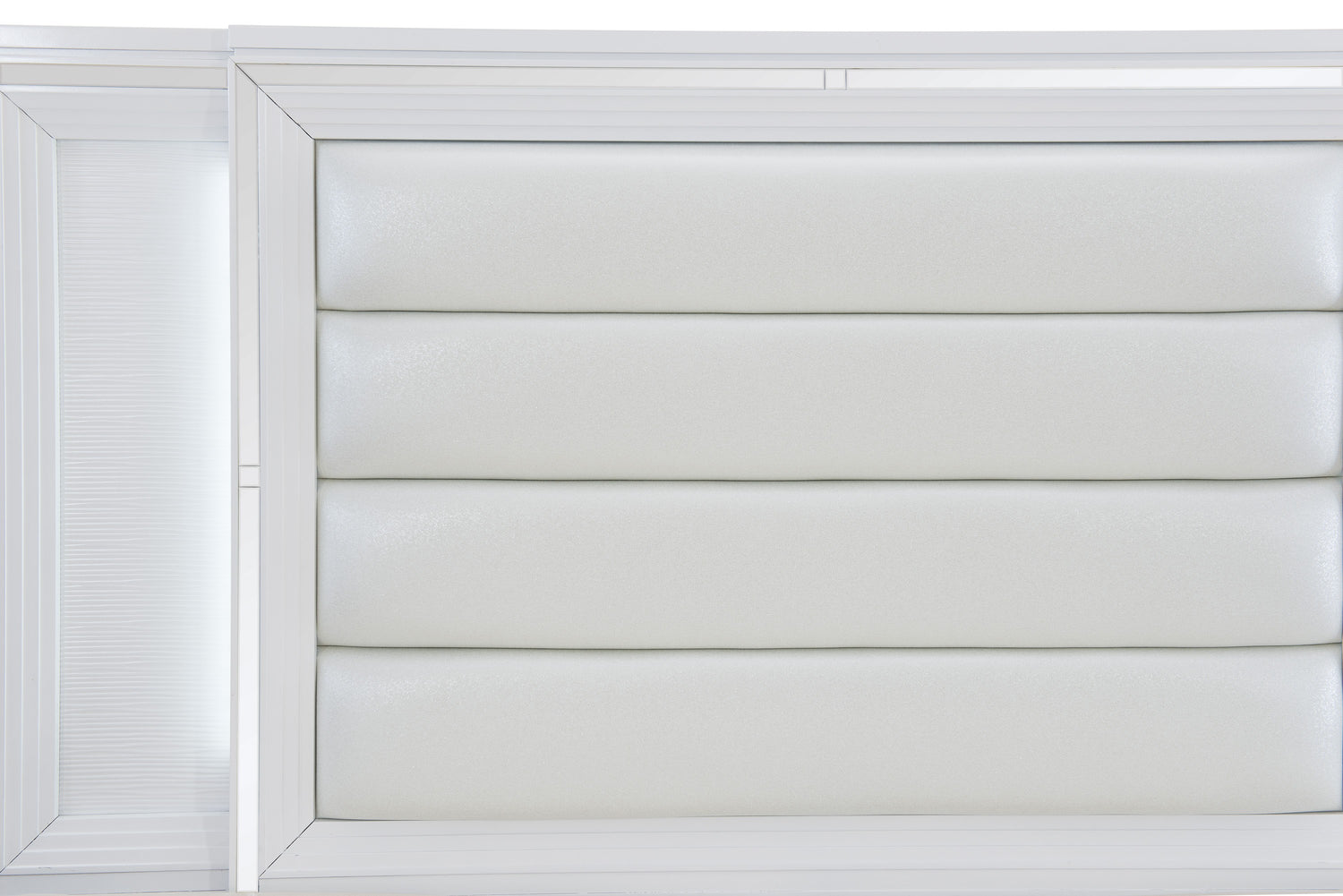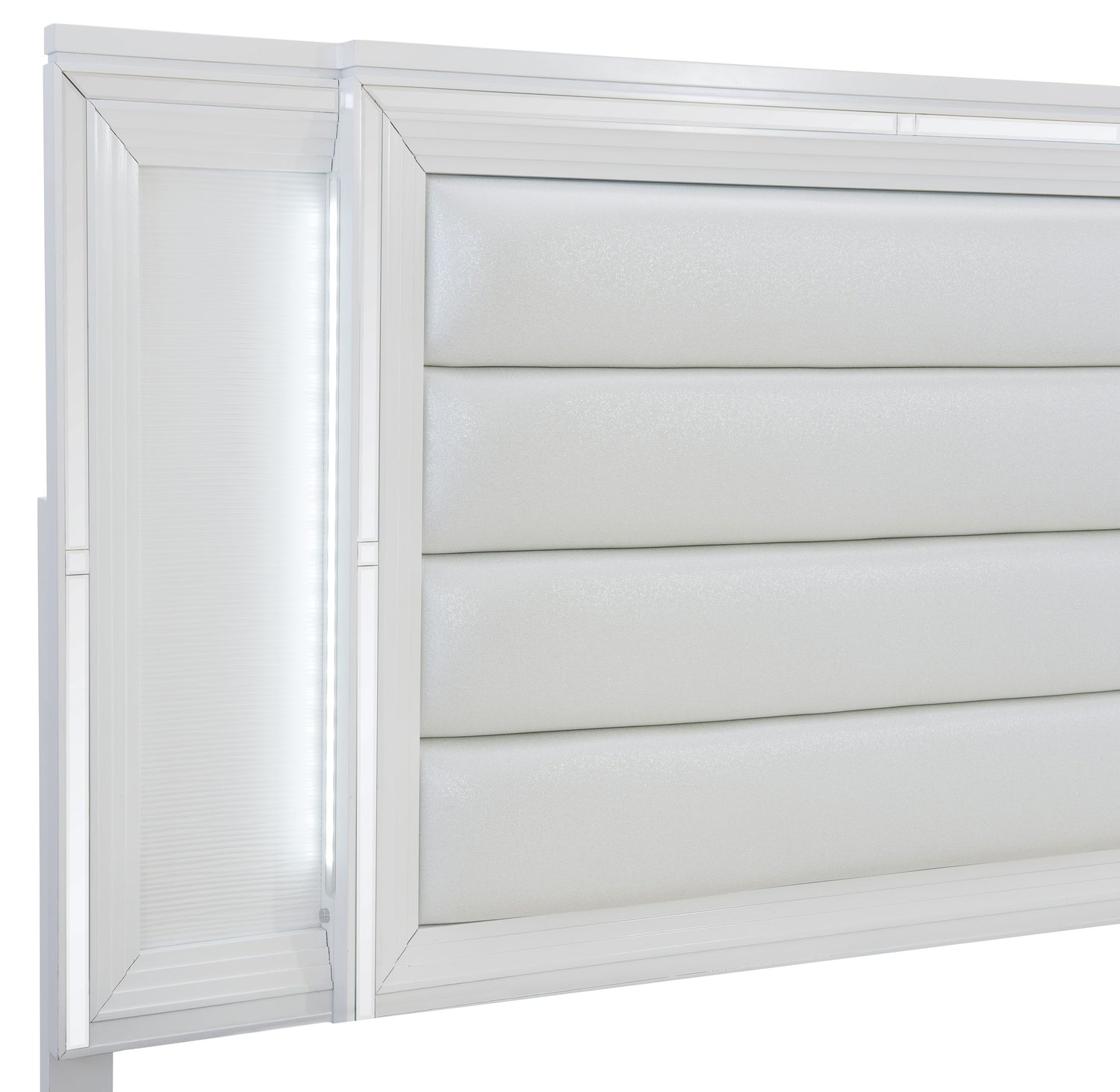 The unique characteristics of the tamsin collection come together to form a fashionable and practical addition to your way of life. this collection was designed to assist your bedroom in realizing its full spectacular potential. mirrored framing adds a dramatic touch to the eastern king bed, while led backlighting emanating from the vertical headboard panels illuminates and draws attention to the collection's embossed white finish. the drawer fronts of the storage footboard include acrylic bar hardware that adds an unobtrusive decorative touch, and the metallic silver fake leather-covered cushioned headboard insert adds decorative contrast to the finish of the set. both elements are included in the collection.