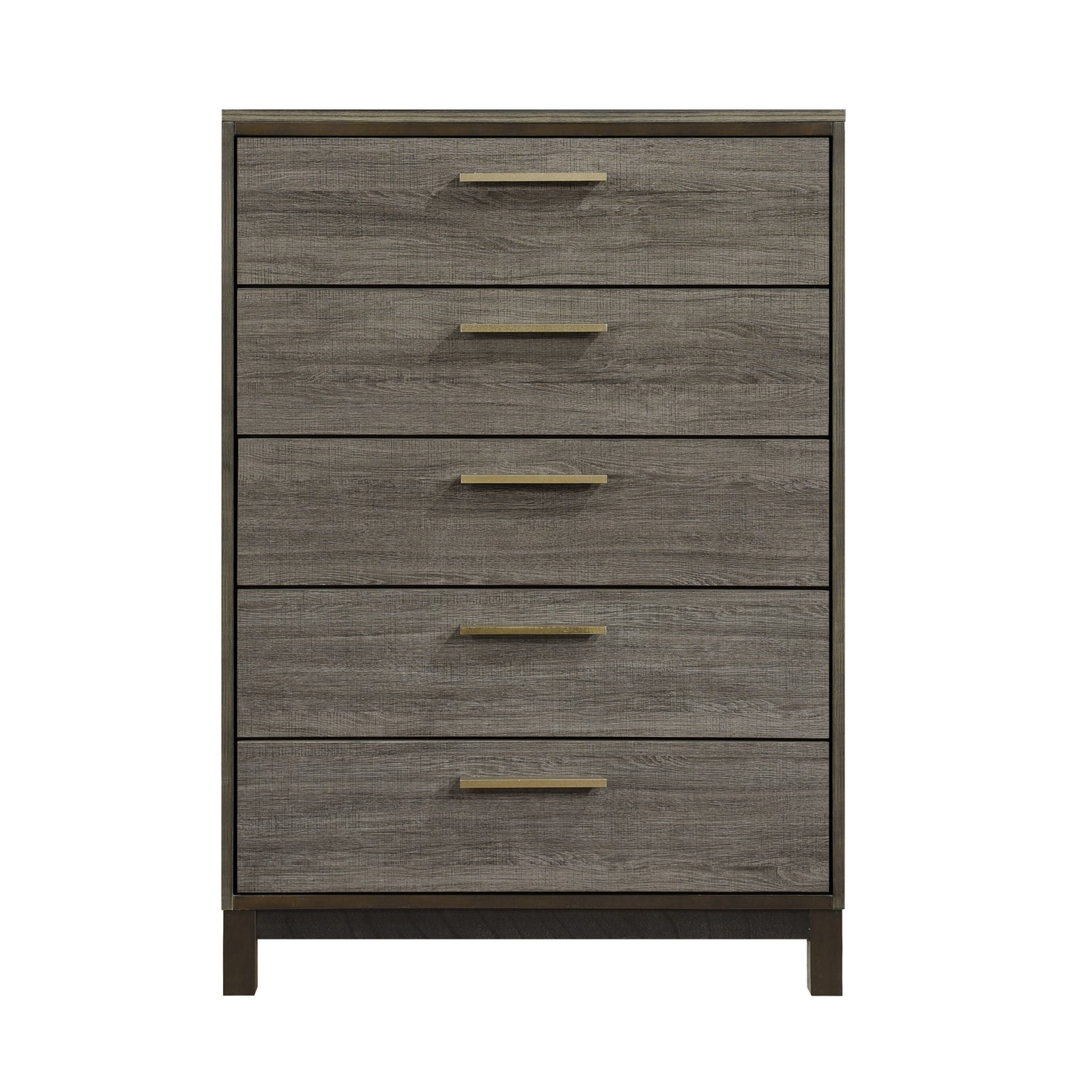 Your bedroom will seem completely different once you've finished redecorating using the vestavia collection because of its modern design aesthetic. the base rail of the chest is a dark brown color, and the chest has a faux wood printed veneer that has a gray finish. this veneer gives a slight roughness. the antique brass tone bar pulls complement the angular aspect of the modern design while also contributing to its clean lines.