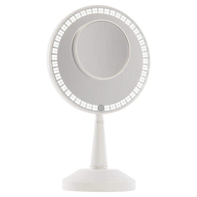 Impression Vanity’s Bijou LED Hand Mirror is the crowning jewel of hand mirrors! The Bijou features a modern pattern of bright LED lights with adjustable brightness. Simply tap the mirror built-in touch sensor to turn on the mirror and press and hold to dim the lights to the level you desire. Includes a 5x magnifying mirror for close up work!
