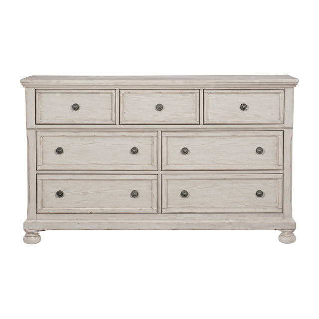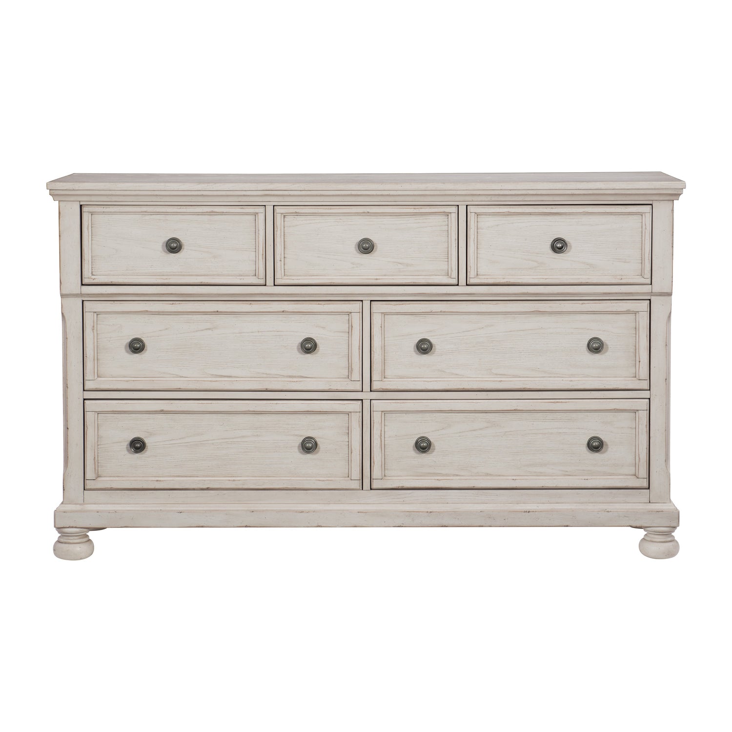 The bethel collection is an updated classic that would be a great accent to your transitional bedroom. the dresser is supported by traditional features such as turned bun feet, and it has an antique white finish that has been softly wire-brushed on ash veneer and chosen hardwoods. this finish combines seamlessly with the frame and lines that suit your individual sense of style. one ingenious method for concealing your valuables is to make use of the dresser's hidden drawer storage. in addition to the option of a gray color, this set also comes with coordinating pieces such as a queen bed, eastern king bed, california king bed, mirror, nightstand, and chest.