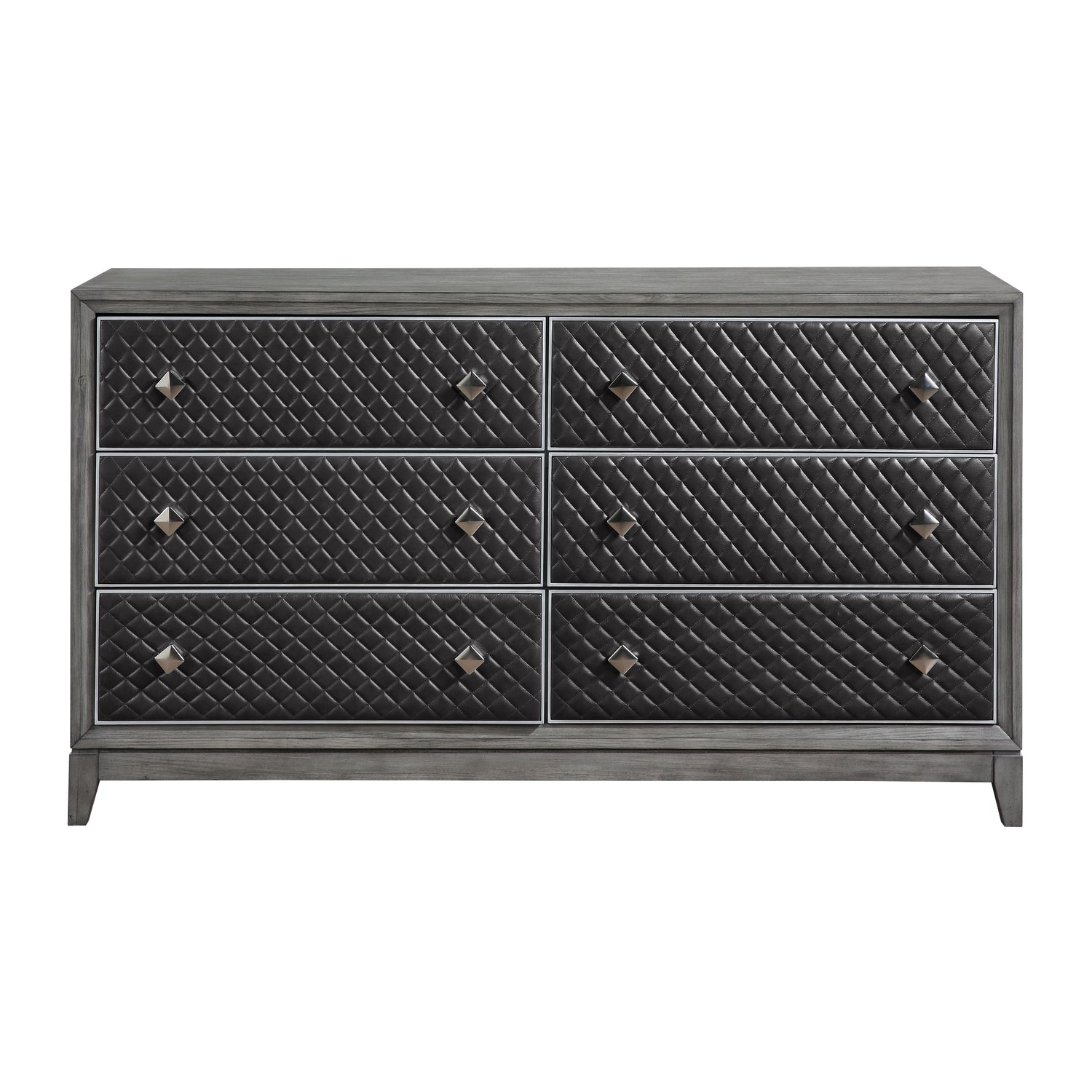 The west end collection achieves its sophisticated appearance by combining timeless design components with eye-catching, bold lines, which ultimately results in a fashionable overall appearance. each offering a complimentary contrast to the gray wire-brushed finish of the collection's birch wood, the painted silver accent delicately frames the diamond-patterned gray faux leather fronts of the dresser. the west end collection features square hardware with a nickel finish on the fronts of each drawer, contributing to its overall contemporary appearance.