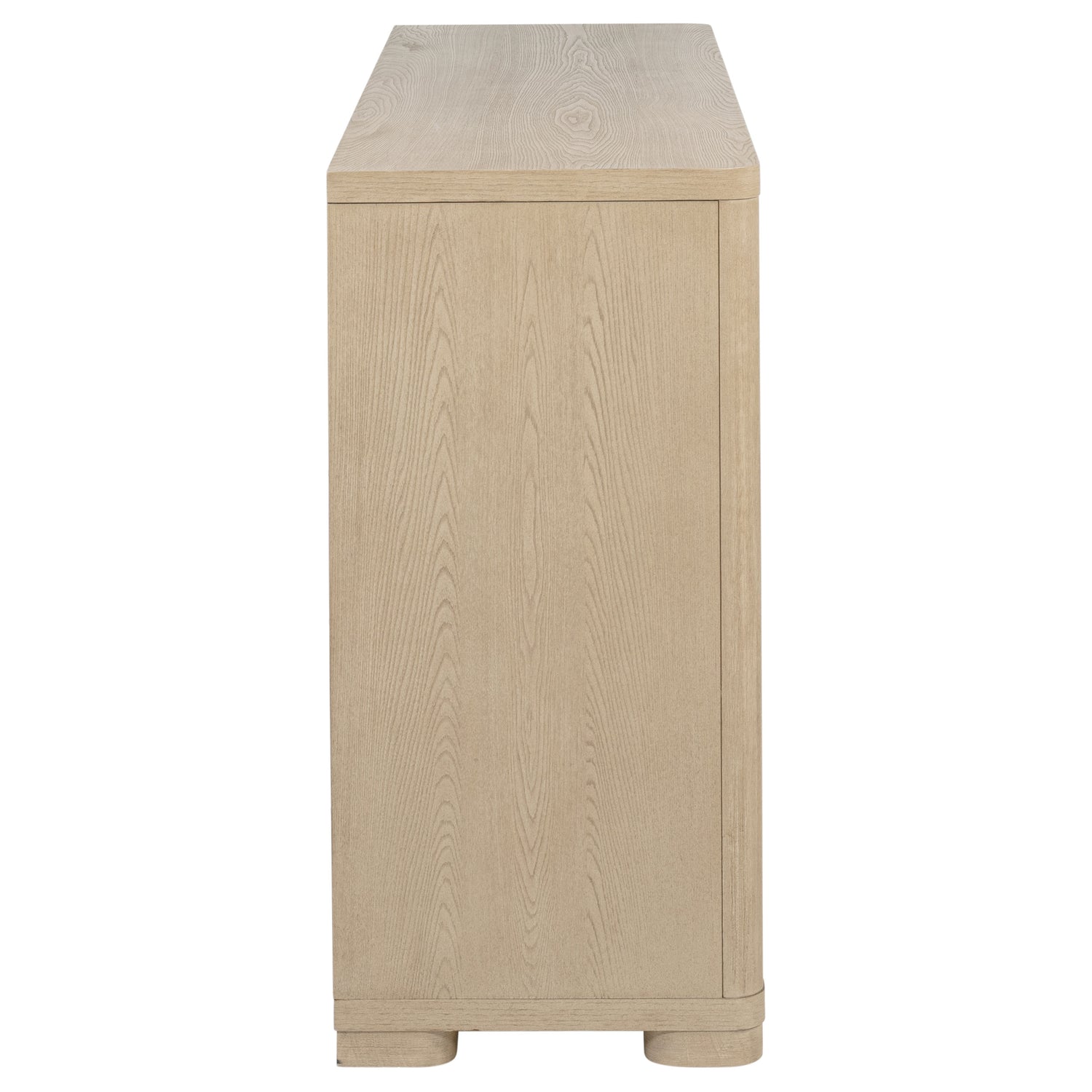 Description: This contemporary six-drawer dresser is designed with clean lines and a light elm finish to complement modern spaces. Brushed nickel fingertip pulls and rounded corners add subtle refinement. The extra-large drawers feature tinted interiors, French dovetail fronts, and English dovetail backs for superior durability. Smooth metal glides ensure reliable performance, making this dresser a stylish and functional addition to any bedroom.
