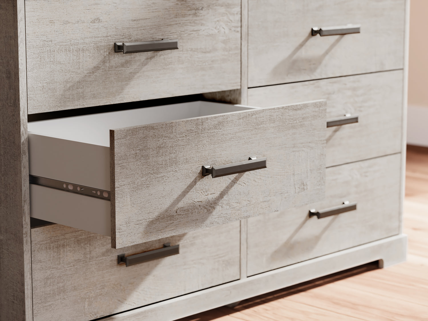 - 6 smooth-gliding drawers with vinyl-wrapped sides and back for durability