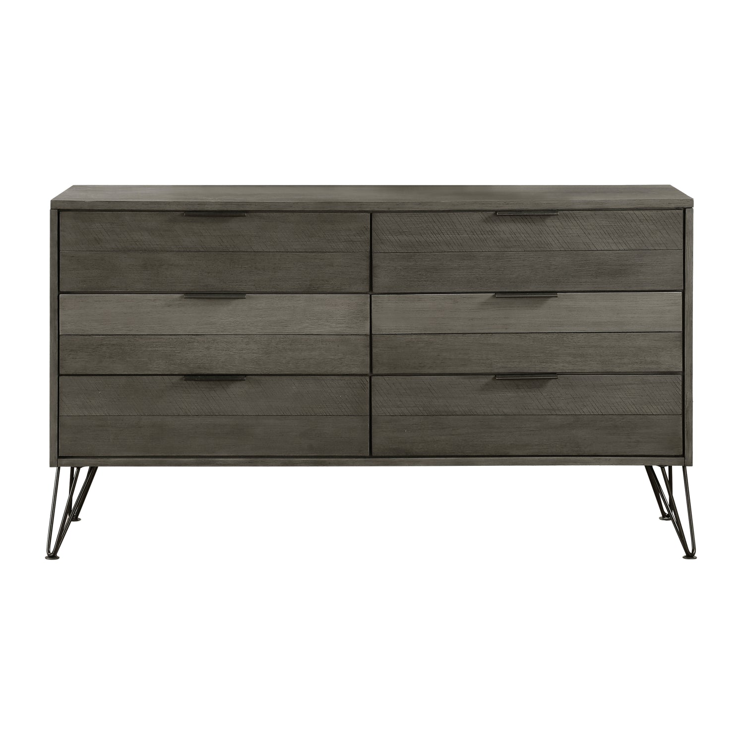 The urbanite collection is the ideal representation of your love for modern style because it is perched atop metal legs, which together provide a bold statement of current styling. the dresser is made of solid acacia wood and veneered acacia wood, both of which are accentuated by a three-tone grey finish that allows the natural variations in the grain to shine through. the sleek, modern appearance is contributed to by elements like as the horizontal slat design, the six-drawer configuration, and the metal pull tab hardware.